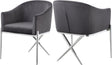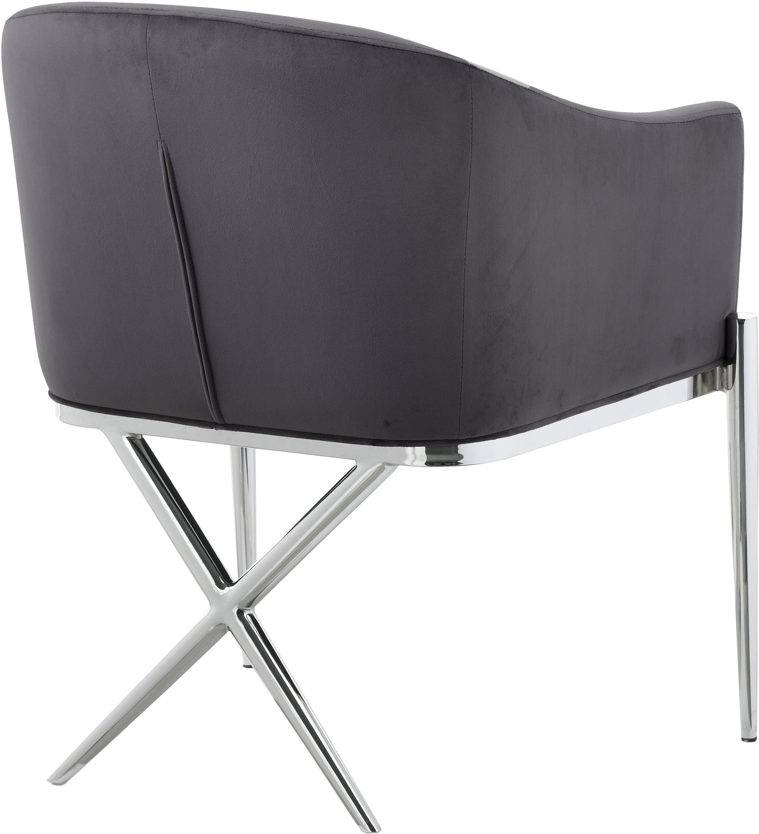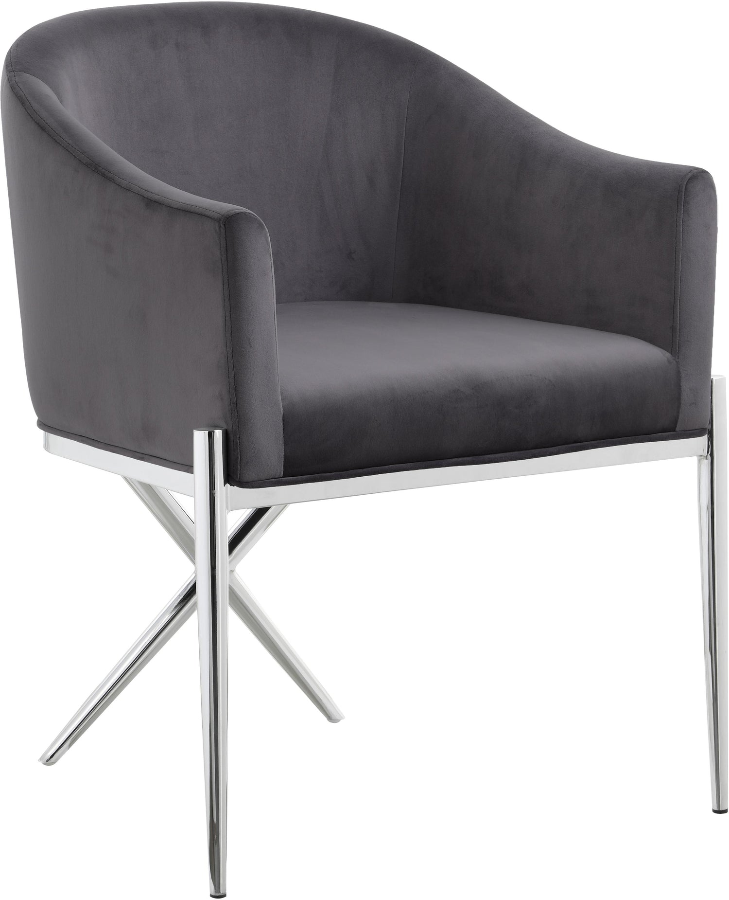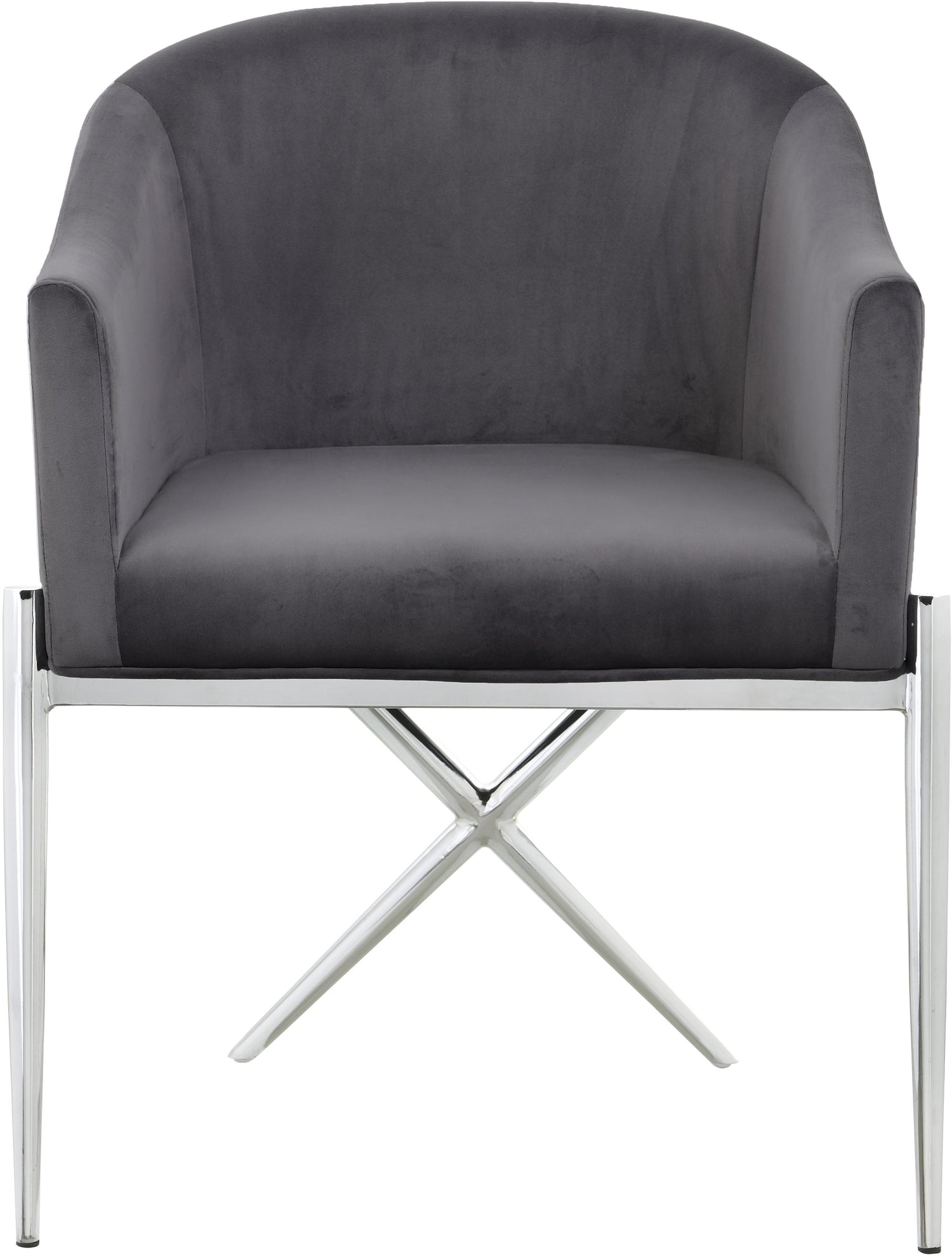 Spread elegance and modernity to your dining room with this Xavier grey velvet dining chair from Meridian Furniture. This beautiful chair features a simple barrel seat with a plush cushion and back, ensuring that every meal is a comfortable one. The chrome steel legs provide durable support while you sit, and an "X" leg in the back lends the chair an uber-modern vibe. Chrome finishing on the base is sleek and chic, giving this chair a contemporary edge that's well at home in any modern dining room. Sleek grey velvet upholstery is durable and tough yet soft against your body, elevating meal times to a luxurious experience.