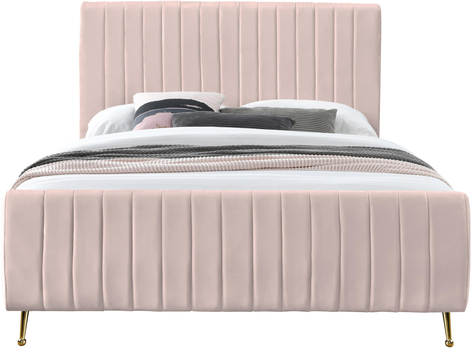 Slip into the lap of luxury with this Zara Velvet Bed. This beautiful king bed is padded to the max on its headboard and footboard for a look that is nothing short of upscale. The luxe design is amplified by the bed���s rich pink velvet upholstery and its deep detailed channel tufting, which also serves to keep the interior padding aloft, full, and comfortable while you relax or unwind in bed. The bed has gold legs for a regal touch, and it comes with slats, so it doesn���t require a box spring.