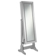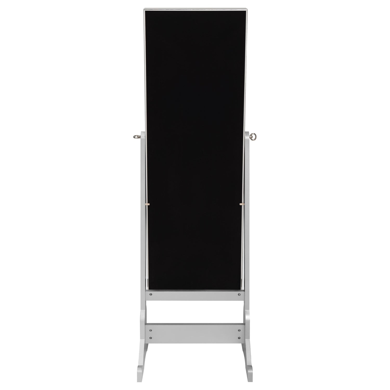 Put the finishing touch on a glamourous bed or dressing room with this stunning floor-length jewelry cheval mirror. Sleek and smooth, the frame features a metallic silver finish. Supportive and intriguing, the delicately curved legs give this mirror its chic personality. Brighten up a space with the light up mirror while keeping your favorite jewelry safe. Angle the mirror upwards or downwards in any bold or neutral decor scheme. Key Features: • Jewelry cheval mirror with LED-lit frame and full-length tilting design • Hidden jewelry armoire includes hooks, ring rolls, and open shelves for storage • Tiltable cheval structure provides adjustable viewing angle for daily use • LED perimeter lighting offers bright, clear visibility while selecting accessories • Freestanding base with curved legs delivers both support and visual appeal • Crafted from engineered wood and mirror for long-lasting functionality and style