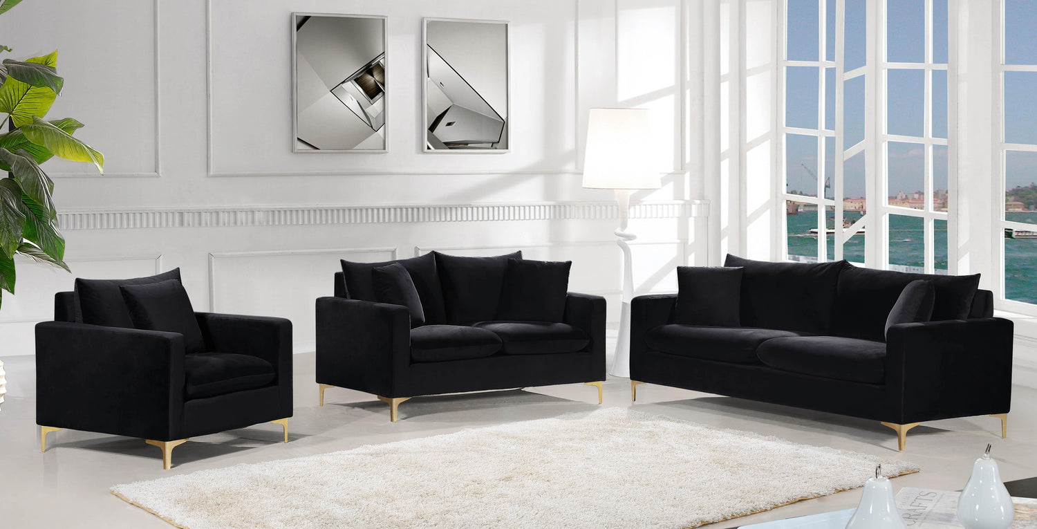 Curl up with a good book from the welcoming confines of this Naomi Black Velvet Sofa. The color of this sofa adds a bold touch to your decor and shakes up otherwise neutral color schemes. Plush velvet material feels cozy and comfortable against your skin, while deep seat cushions provide lots of room for you to stretch your legs. This sofa comes with both gold and chrome legs, so you can customize its look to meet your decor plans. Pillows are included for added homey warmth and comfort.