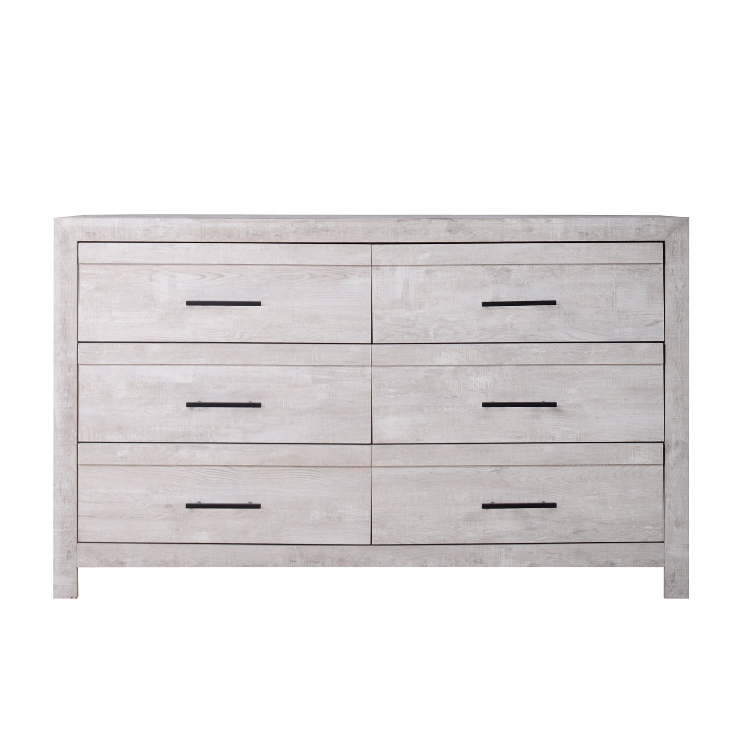 Introducing the Biscayne Six Drawer Dresser, meticulously crafted with durable manufactured wood and adorned with an Eco-Friendly decorative laminate for enduring strength and stability. Its Driftwood finish creates a light, airy ambiance, perfect for unwinding at the end of a busy day. The dark iron finish drawer pulls add a contemporary touch, contrasting beautifully with the dresser's clean design. Versatile in style, this dresser seamlessly blends with various motifs, from coastal to contemporary, farmhouse to urban rustic. Plus, with time-tested drawer construction featuring English dovetail joinery and smooth metal center drawer glides, functionality meets elegance in this essential bedroom piece.