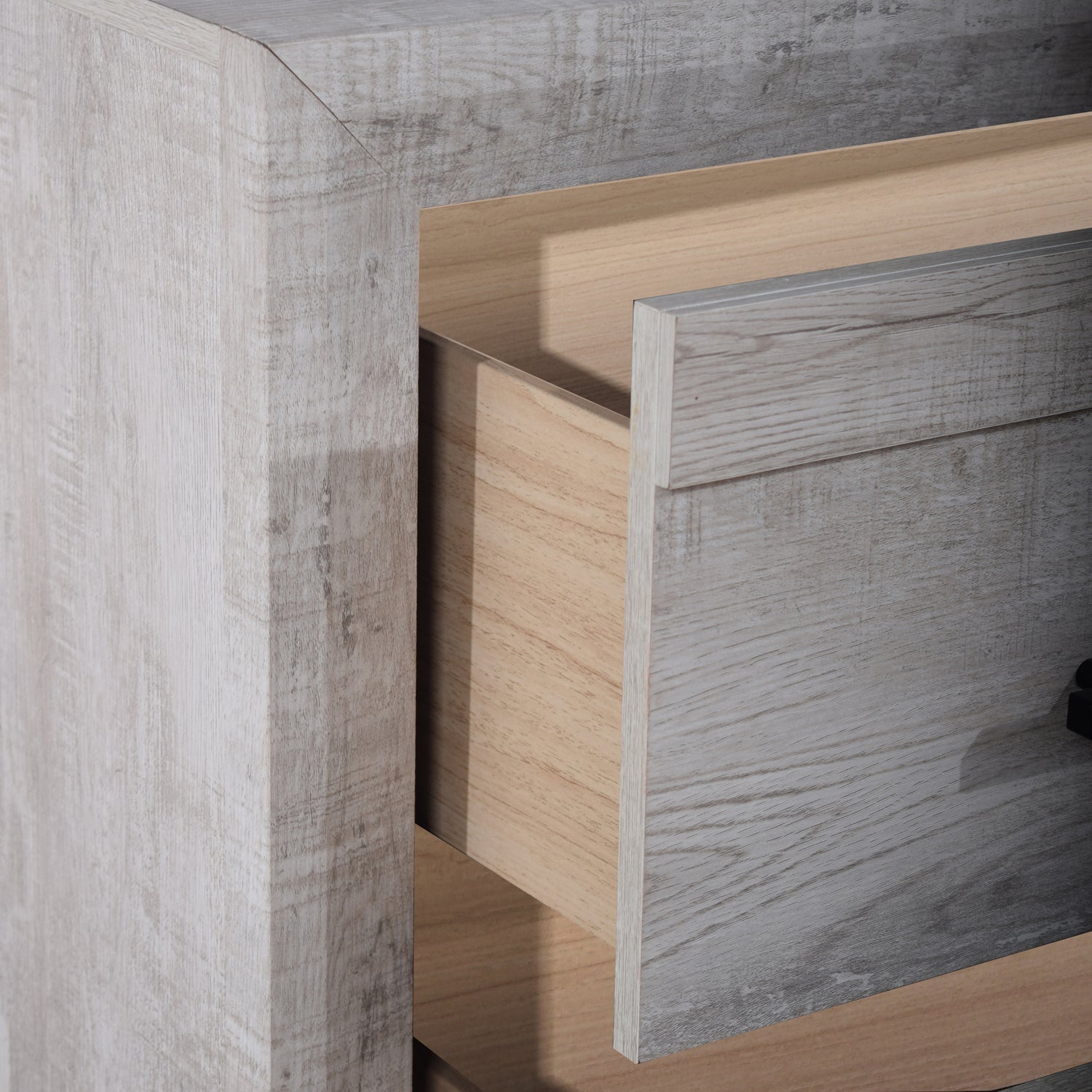 - Distinctive Accents: The dark iron finish drawer pulls contrast nicely against the light finish for a clean, updated look.