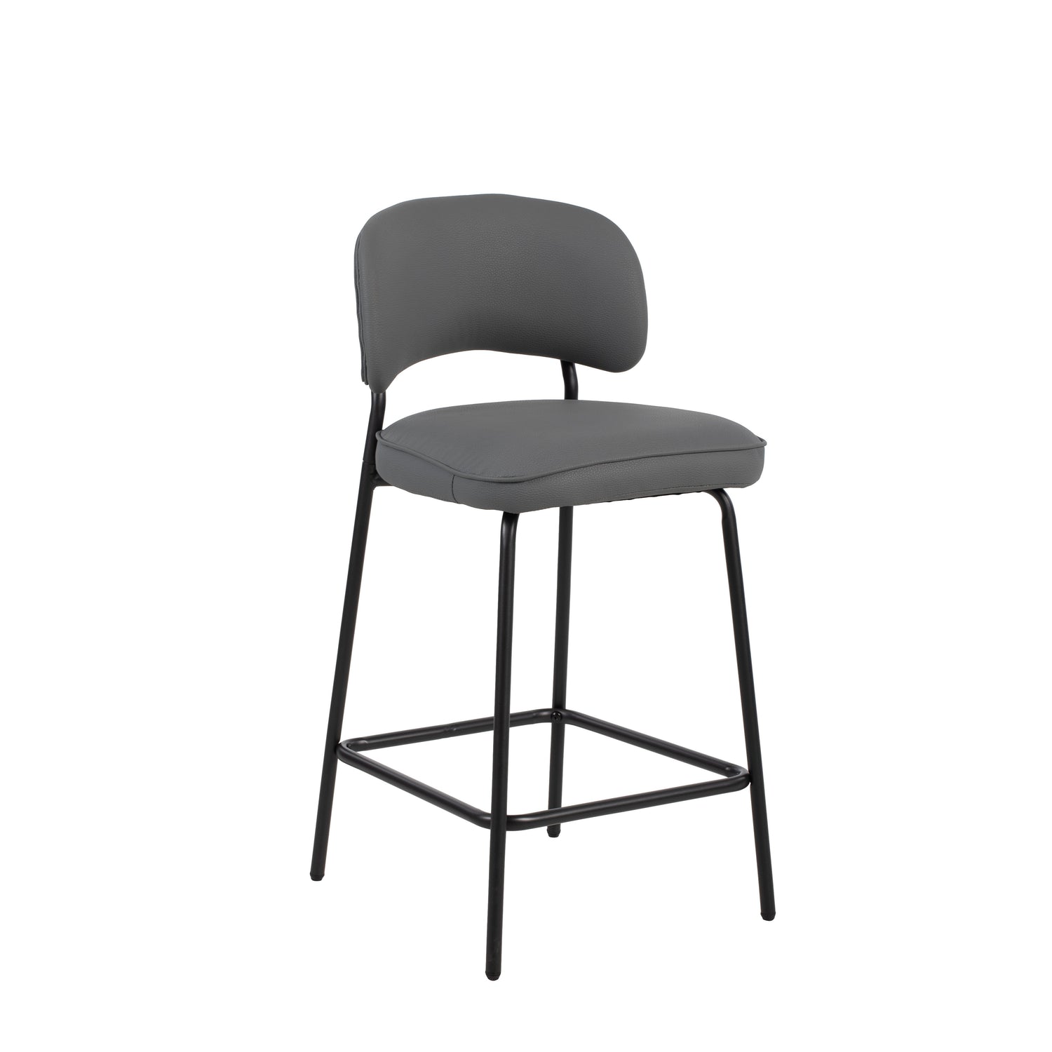 The Blythe Gray Faux Leather Counter Chair set combines modern design with practical comfort, perfect for enhancing any contemporary space. Each set includes two counter-height chairs with a sleek, arched back and low profile for a refined look. The gray vegan leather delivers the luxurious appeal of leather without the maintenance, offering a durable and eco-friendly seating solution. The sturdy black iron legs provide exceptional stability, resisting bending or breaking, while the contrast between the black legs and the upholstery creates a sophisticated, modern style. Dual-purpose footrests ensure added stability and provide a comfortable place to rest your feet. These chairs offer a perfect blend of style, comfort, and durability, making them an ideal choice for any home or kitchen setting.