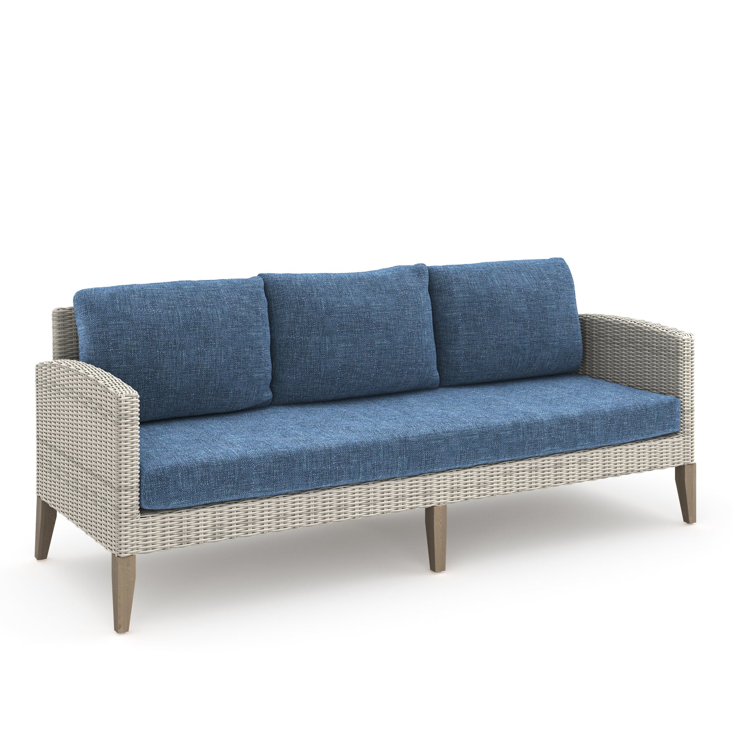 Introducing the 5 Piece Carezza Outdoor Collection, where durability meets comfort in a seamless blend of style and functionality. The set includes a roomy three seater sofa, 2 comfortable club chairs and 2 oversize stools. Crafted with precision using FSC Certified Acacia solid wood, weather-resistant wicker, and aluminum frames, this collection stands the test of time, promising years of outdoor enjoyment. The color fast, weather-resistant fabric, made of solution dyed 100% Polyester, ensures vibrant hues that resist fading, mold, and moisture, keeping your furniture looking fresh season after season. Sink into the lap of luxury with the high-density, 12cm foam seat and back cushions, providing unparalleled comfort for hours of relaxation. With its relaxed transitional style, featuring light wicker and wood finishes complemented by soothing blue fabric, this set effortlessly transforms your outdoor space into a casual, welcoming retreat. Assembly is a breeze, taking approximately 45 minutes to secure legs to all five pieces, with clear instructions provided for your convenience. Elevate your outdoor living experience with the Carezza Outdoor Collection, where every piece is meticulously designed for your comfort and enjoyment.
