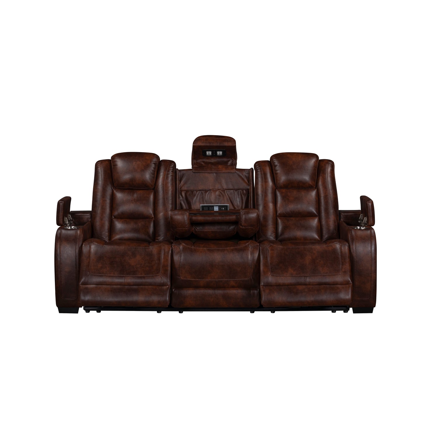 The Chester Reclining Sofa in brown is designed to combine modern aesthetics with superior comfort and practicality. Crafted with hardwood and plywood interior frames and robust motion mechanisms, this sofa promises long-lasting durability and can support up to 350 pounds per seat. Its rich brown color and clean lines bring a contemporary appeal to any living space. The supportive seating structure, featuring a blend of springs and plush foam, ensures consistent comfort and maintains the sofa’s shape over time. The soft, PU synthetic leather fabric is not only durable but also easy to maintain, resisting stains and scratches. With two power recliners, you can find your perfect position at the touch of a button, making it ideal for living rooms and home theaters. Additional lifestyle features include storage arms for remotes or books, and a back center cushion that converts to a snack tray with built-in drink holders, reading lamps, power outlets, and a USB charger. The Chester Reclining Sofa offers unparalleled comfort and convenience, making it an excellent addition to your home.