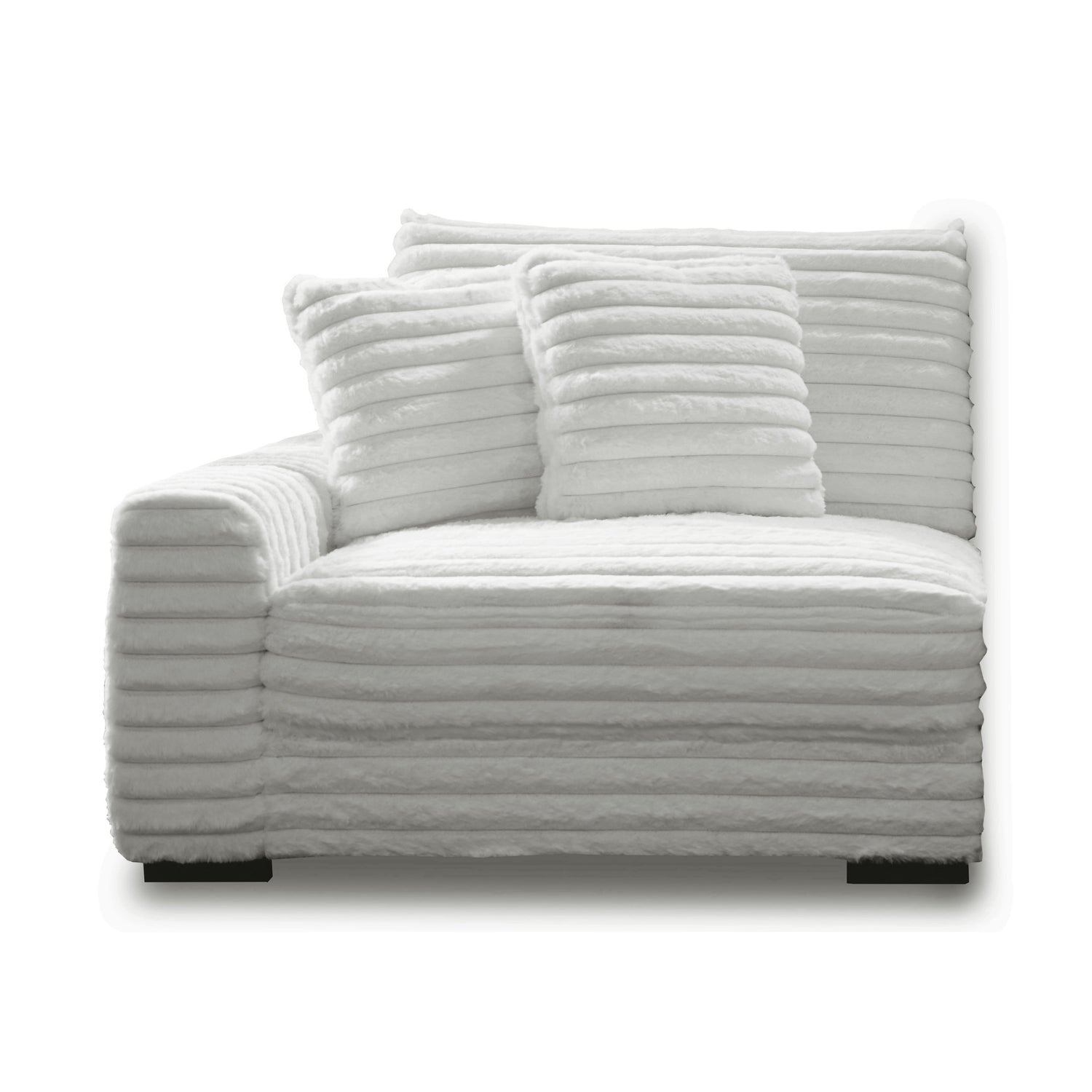 The Embrace Left Arm Facing Chair with 2 Accent Pillows in white is a sophisticated and comfortable addition to your sectional arrangement. Featuring 100% white polyester fabric with a fluffy, blanket-like texture, this chair promises ultimate relaxation. It includes two plush accent pillows that enhance its luxurious ribbed channel fabric. The high-density, resilient foam cushions provide supportive seating, ensuring a cozy lounging experience. Constructed with a strong and durable frame made from a combination of solid and manufactured woods, this chair offers long-lasting quality. Its versatile, transitional styling makes it a seamless fit with the rest of the Embrace collection, inviting you to lounge and unwind in unparalleled comfort. Perfect for use with the Embrace Sectional, this chair is designed to complete your living space with both style and function.