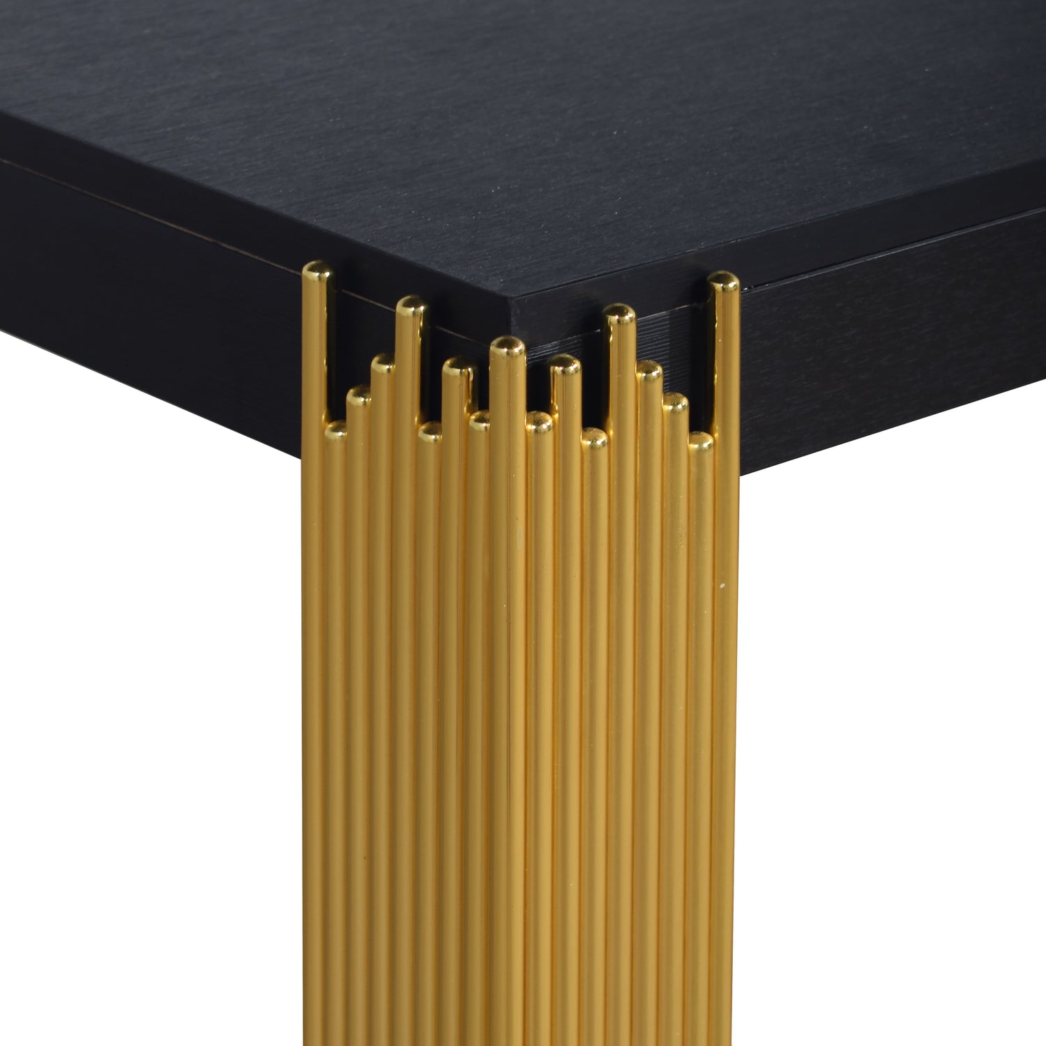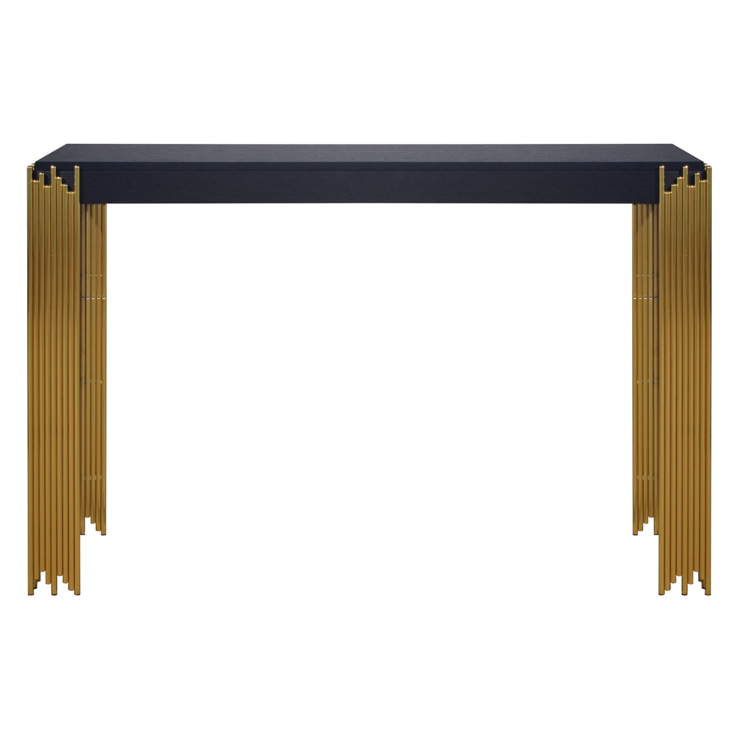 The EMPIRE Console Table in sleek black is a stylish and durable addition to your living space. Crafted with eco-friendly manufactured woods and decorative laminate, this table ensures lasting strength and durability. Its sophisticated black finish adds a touch of contemporary elegance to any room, while the modern metro style, featuring gleaming gold tiered legs, captures the enchanting ambiance of a city skyline shimmering under the stars. Elevate your space with the Empire Console Table, where sleek design meets long-lasting construction.