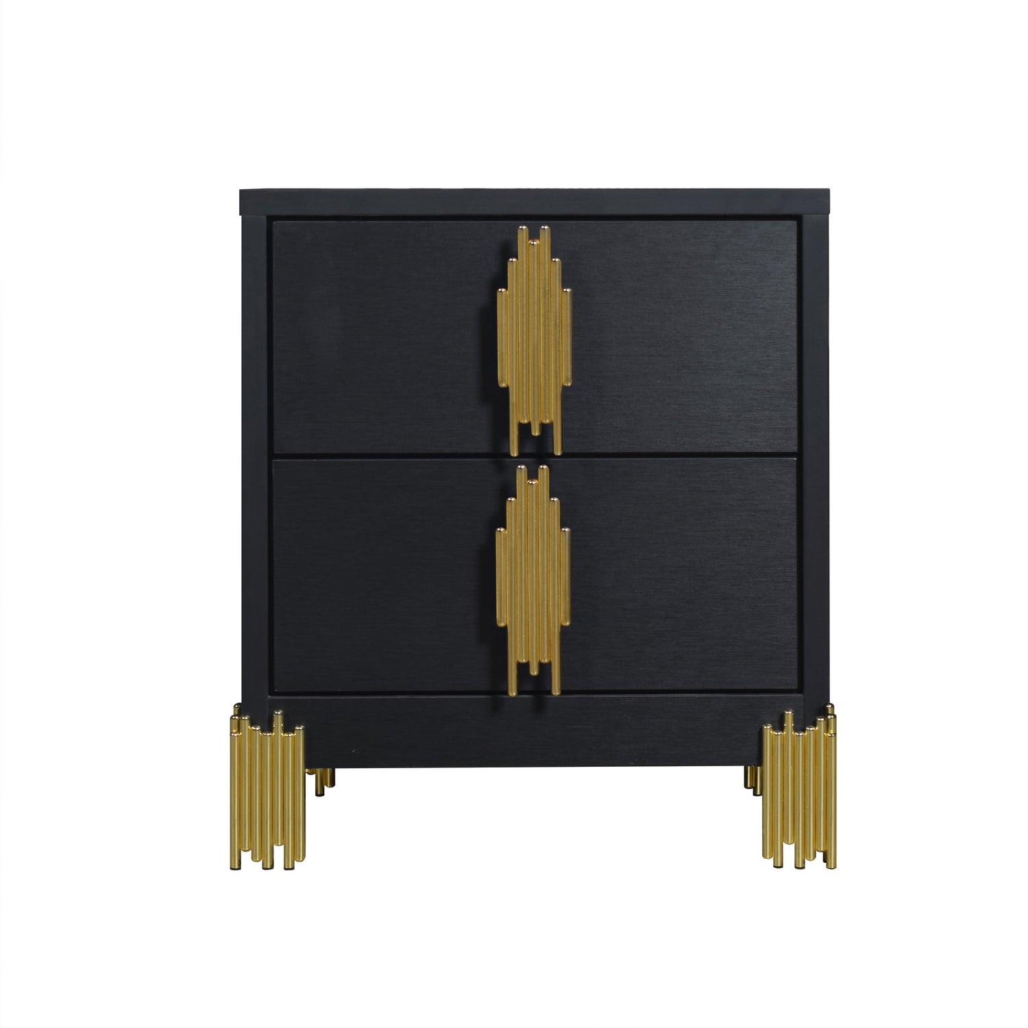 Introducing the Empire 2 Drawer Nightstand in sleek black, a stylish addition to any bedroom. Crafted with lasting durability in mind, this nightstand features eco-friendly materials and a sophisticated finish for a contemporary touch. Its gleaming gold drawer pulls and feet evoke the charm of a city skyline at night. Inside, the drawers boast English dovetail joinery and ball bearing glides, ensuring smooth and reliable functionality. Enhance your bedroom with the EMPIRE 2 Drawer Nightstand, where beauty meets quality in every detail.