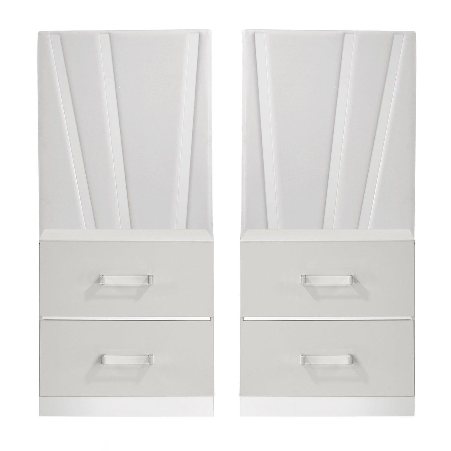 The Europa decorative back panels are designed for use with the Europa Nightstand. The Europa's sophisticated look is achieved through a gleaming white finish, mylar accents, and acrylic drawer pulls. Quality craftsmanship is evident in the eco-friendly manufactured woods, assembled for durability, with surfaces finished in a glossy white topcoat and padded upholstery. Upscale extras include silver mylar pedestal bases and decorative panel accents, enhancing the glamour of these nightstands. The sturdy, well-constructed drawers feature dovetail joinery and ball bearing glides for a durable, easy-glide operation, with interiors finished for snag-free storage. The two-drawer nightstands offer ample storage for bedside essentials. Choose the Europa Nightstands to add a touch of modern luxury and practicality to your bedroom.