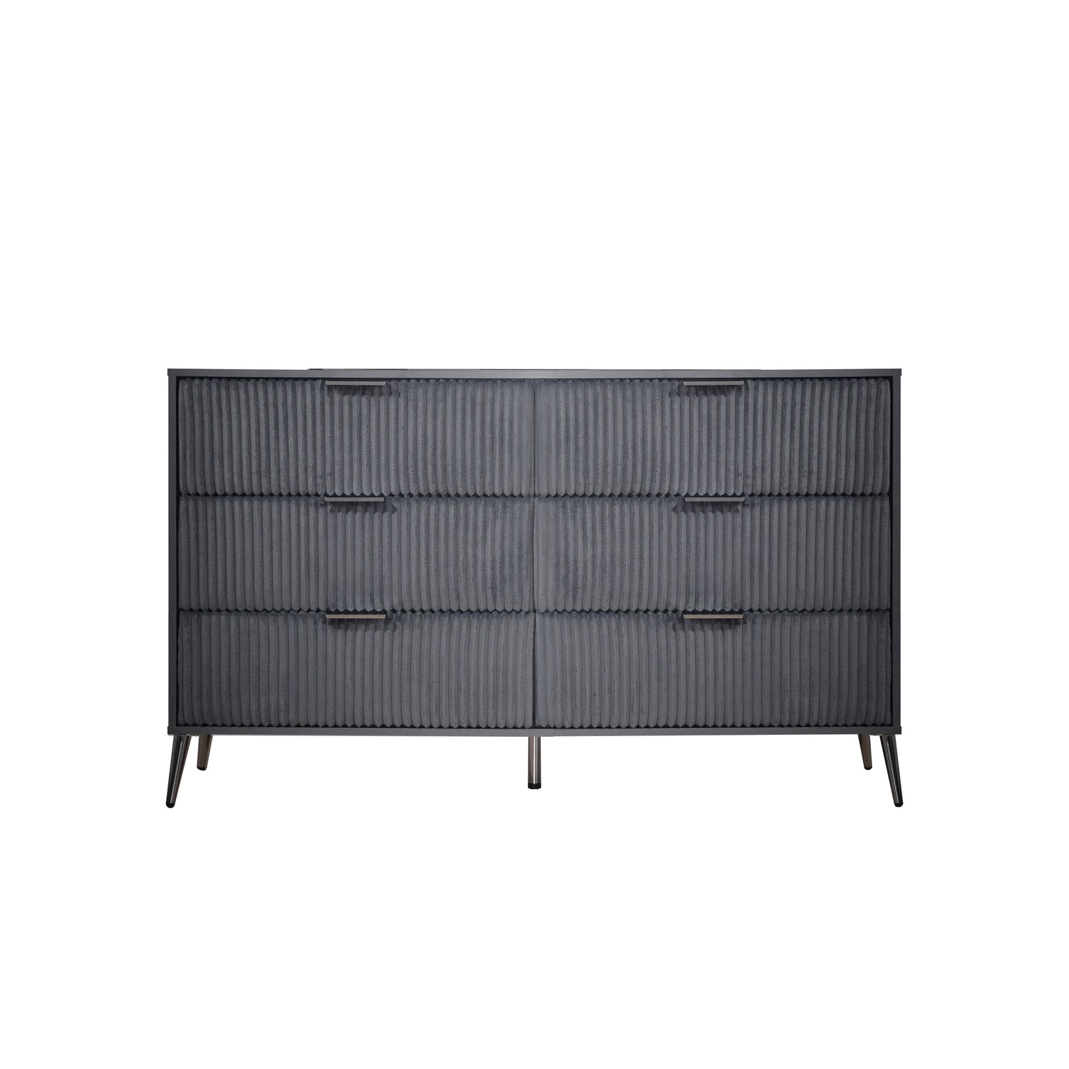 The Kailani 6 Drawer Dresser in gray combines modern minimalist design with durable, eco-friendly construction, making it a stylish and sustainable choice for any bedroom. Crafted from solid rubberwood, engineered wood, and eco-friendly decorative laminate, this dresser is built to last with resistance to scratches, moisture, and stains, ensuring long-term beauty with minimal upkeep. The dresser features clean lines, a sleek silhouette, and a chic ribbed texture, complemented by slim metallic handles and tapered legs that enhance its contemporary appeal. Wrapped in luxurious gray 100% Polyester Velvet, the textured drawers are accented by chrome pulls and glide effortlessly on full-extension slides, with dovetail joinery providing lasting strength and smooth operation. This dresser not only adds a touch of sophisticated glamour to your space but also offers practical, snag-free storage, making it a perfect blend of form and function.