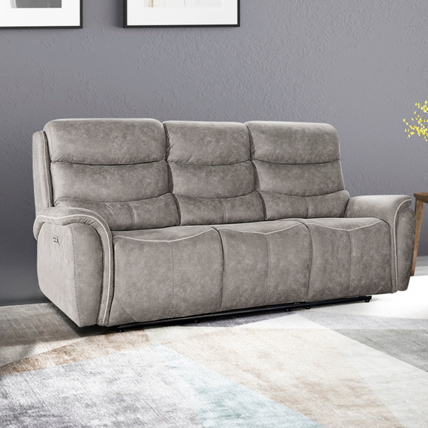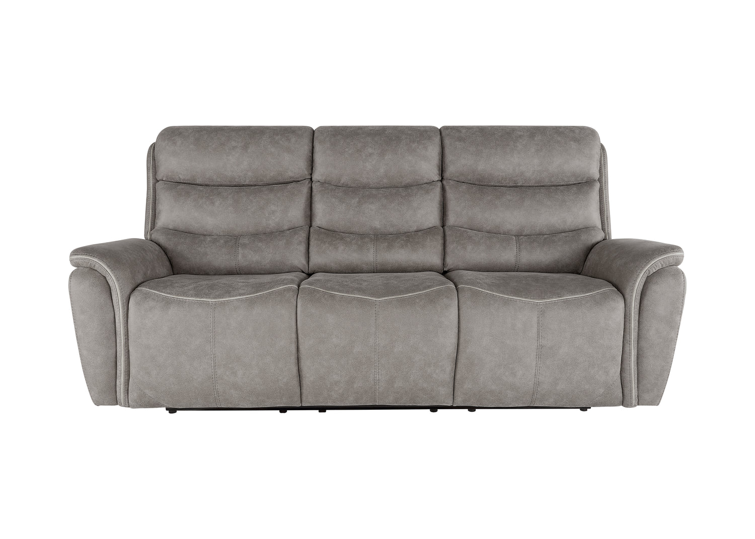 Experience the epitome of comfort and style with the Kamari Reclining Sofa with Power Headrests and Footrests in Gray. Immerse yourself in the plush, suede-like softness of its dappled gray upholstery, meticulously crafted from a blend of polyester and PU fabric. Tailored to perfection, with triple roll backs, bucket seats, and wrap-around arms adorned with tasteful contrasting welt, this sofa exudes sophistication. Unwind effortlessly with fully upholstered chaise recliner footrests and adjustable headrests, customizable at the touch of a button. Built for enduring comfort and support, its hardwood and manufactured wood frames, resilient foam and polyester-wrapped coil spring cushions, and no-sag seat suspension ensure years of enjoyment. Stay connected with built-in USB chargers, while its versatile style effortlessly complements any decor, making it an essential addition to your living space.