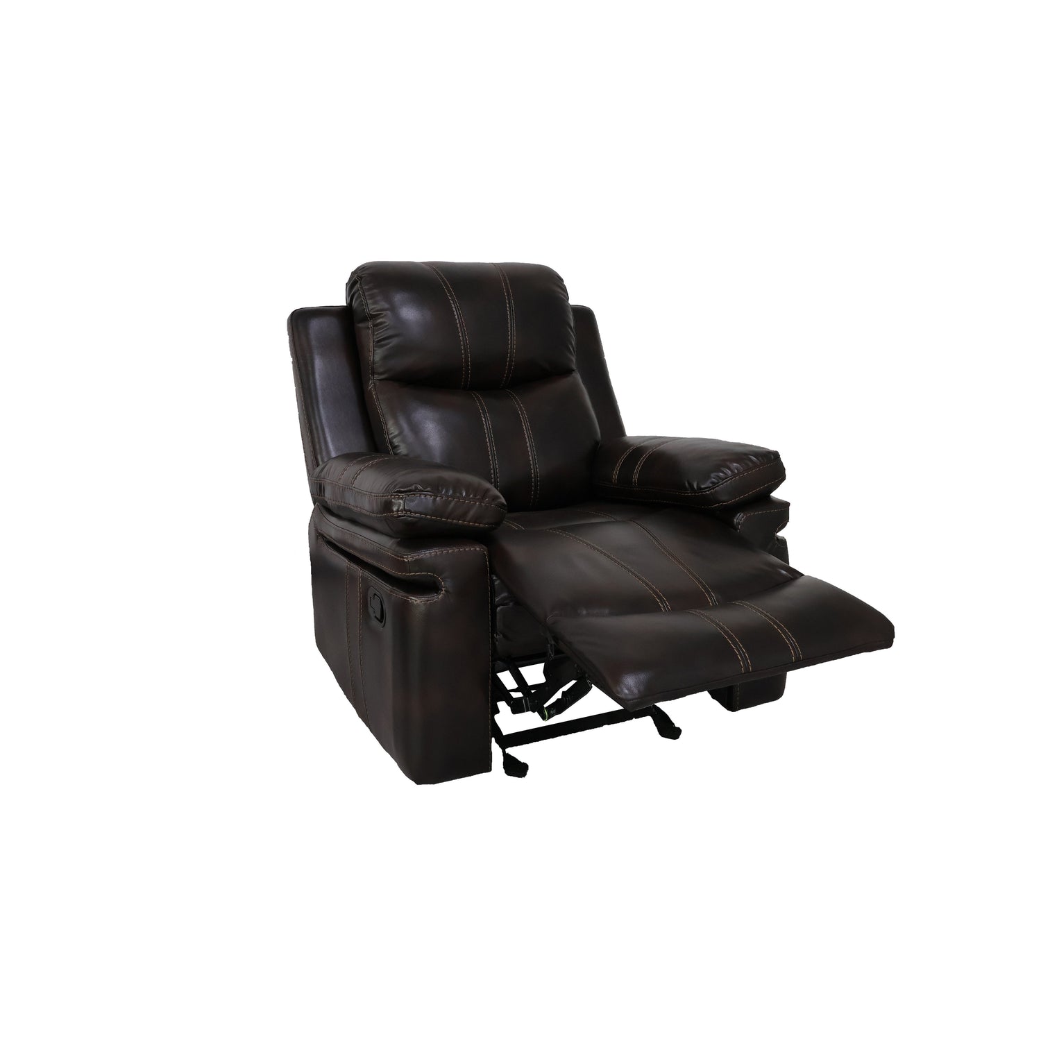 The Kellen Glider Recliner in rich brown offers the perfect balance of luxurious comfort and durability. Built with premium hardwoods and plywood, its sturdy frame ensures long-lasting stability, while the resilient foam cushions and advanced pocket coil technology provide exceptional support that holds its shape over time. The upholstery, crafted from an 80% polyester and 20% PU blend, delivers the soft, supple feel of leather with the added benefits of breathability and sustainability. Thoughtful details, including side channels, contrast baseball stitching, and plushly pillowed head and armrests, showcase expert tailoring and elevate the aesthetic of any room. Whether you prefer the gentle, soothing glide or the ease of reclining with its smooth-action, heavy-duty mechanism, the Kellen Glider Recliner offers the ultimate spot to unwind in unparalleled comfort.
