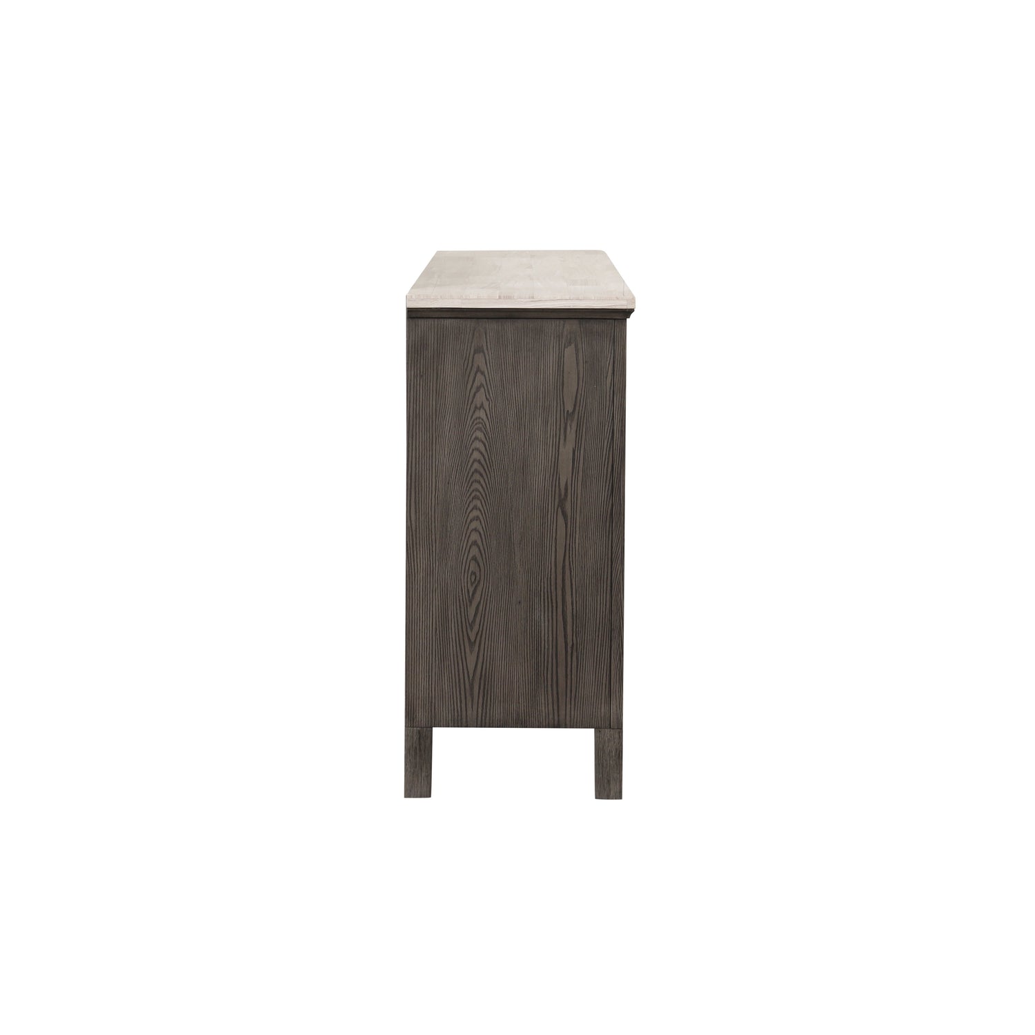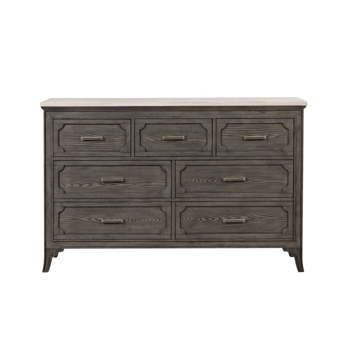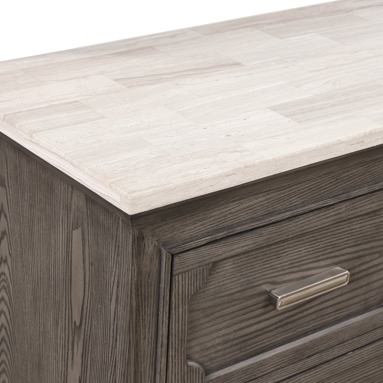 Add a touch of luxury to your bedroom with the Lisbon Marble Top Dresser in Gray. Crafted from Acacia solid wood and eco-friendly embossed oak laminate, this dresser ensures lasting strength and durability. Its multi-step gray finish enhances the natural beauty of the wood, creating a sophisticated ambiance in your room. The genuine white marble top adds distinct character and provides a long-lasting surface. Featuring heirloom drawer construction with English and French dovetail joinery, full extension glides, and finished interiors, this dresser offers both durability and functionality. The top drawers are lined with felt to protect delicate items. With traditional elements like bracket feet and picture frame moldings combined with modern brushed pewter hardware and a fresh gray finish, this dresser offers a timeless style with a contemporary twist. The Lisbon Marble Top Dresser is the perfect blend of elegance and practicality for your bedroom.