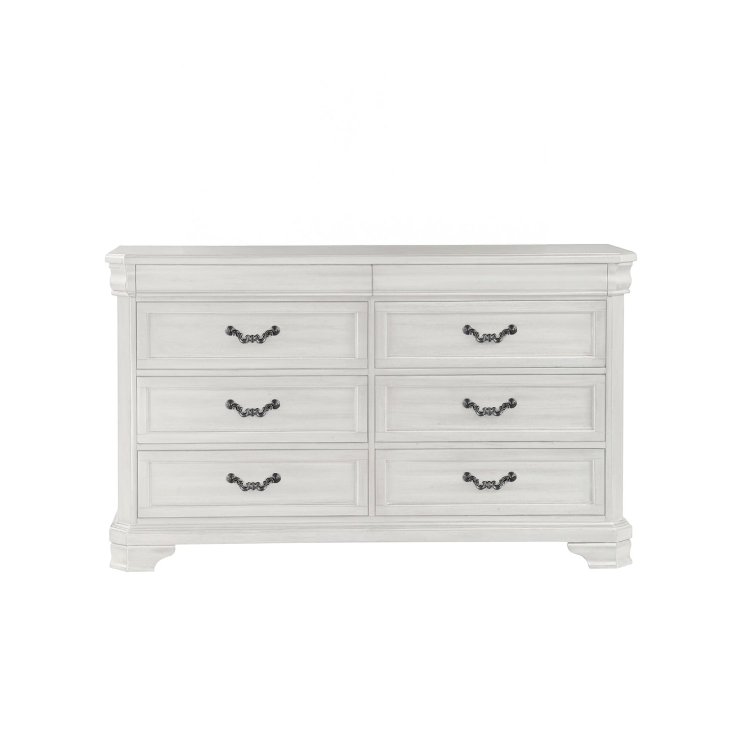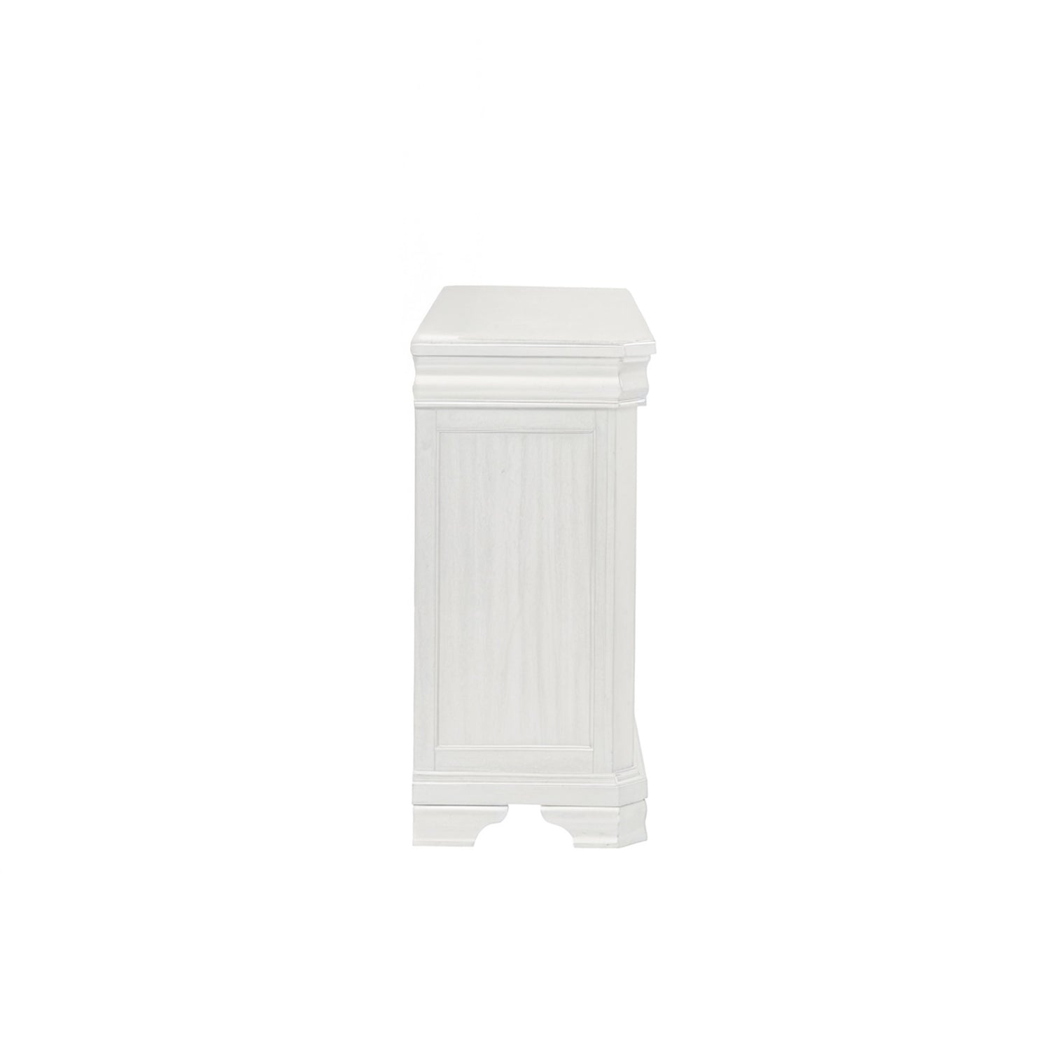 - Vintage White Finish: The heirloom finish is achieved through a multi-step process that includes mild distressing, burnishing, and gray glazing that enhances the natural beauty of the wood.
