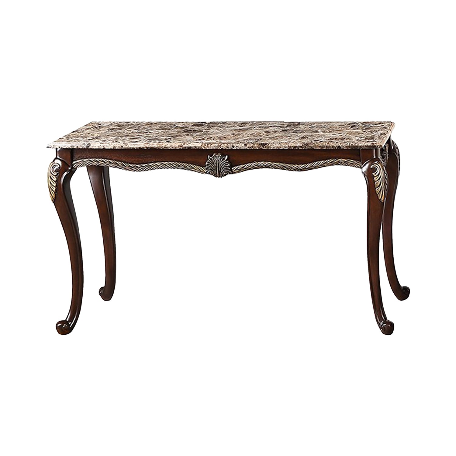 The Royal Classics Maximus Sofa Table in cherry is a perfect blend of heirloom craftsmanship and timeless design. Expertly crafted from solid pine with premium polyurethane carving details, this table offers both durability and long-lasting beauty. The lightweight yet robust carvings are resistant to moisture, rot, and cracking, ensuring their intricate detailing remains flawless over time with minimal maintenance. Finished with a meticulous multi-step process, the table enhances the natural beauty of the wood grain. The traditional Baroque-inspired design features ornate Rococo-style carvings that bring a sense of regal elegance to your home. Topped with a sophisticated marble surface, the rich blend of deep brown tones is accented by intricate white and beige veining, creating a luxurious, dynamic look. The swirling patterns and striking contrast between the dark hues and lighter streaks beautifully complement the ornate wooden base. The perfect statement piece for your hallway, entryway or living room.