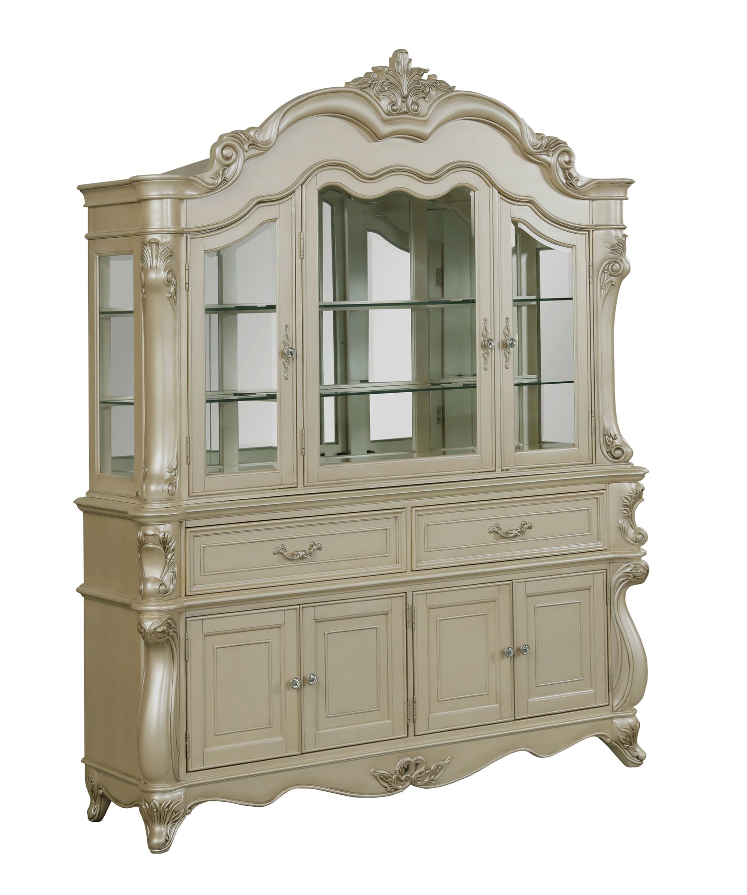 Designed to be used with the matching Buffet , the Monique China Hutch in Champagne combines timeless elegance with heirloom-quality construction. Crafted from poplar solids and birch veneers, this piece is built to last, ensuring strength and durability. Its intricate detailing and ornate carvings are characteristic of classic Baroque furniture, known for its opulence and grandeur. The elegant curved lines and elaborate design elements enhance its sophisticated look, making it a striking centerpiece for any dining room. The intricate, multi-step champagne finish is painstakingly applied to enhance the natural beauty of the wood, with antique gold glazing highlighting the moldings and carvings. Inside, thick tempered glass shelves provide ample space to display your finest china, protected behind intricately shaped beveled glass doors. Thoughtful extras include exterior touch controls for display lighting, which add ambient lighting to your dining space. Transform your dining area with the Monique China Hutch and enjoy unparalleled elegance and functionality.