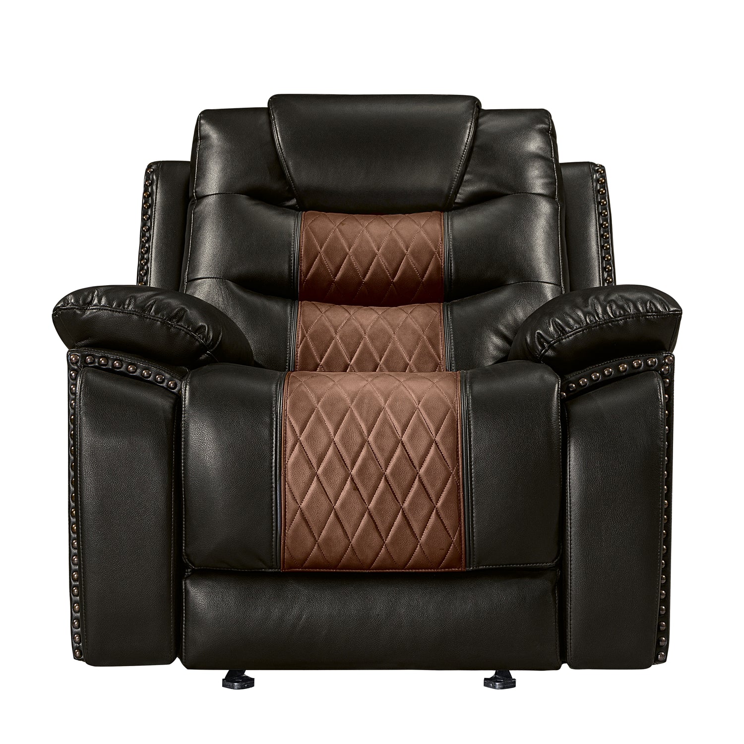 Experience unparalleled comfort with the Nikko Glider Recliner with Hidden Cup Holders in brown. This recliner is built with long-lasting construction, featuring frames crafted from hardwoods and plywood for a stable and durable seating experience. Enjoy luxurious seating with resilient foam cushions and pocket coil support, offering a cozy place to lounge. The two-tone chocolate and saddle brown fabric, made from 80% polyester and 20% PU, provides the soft touch and look of leather with added breathability. Distinctive details such as nailhead trim, diamond stitch pattern seats, double wrapped headrests, and expert tailoring make this recliner a standout addition to any home. Practical lifestyle features include conveniently placed hidden cupholders in discreet pullout compartments under the armrests. The glider recliner offers soothing, gentle gliding action, plush pillowed arm and headrests, reclining backs, and comfortable footrests, providing the ultimate place to unwind. Enjoy unparalleled comfort and style in your home with the Nikko Recliner.
