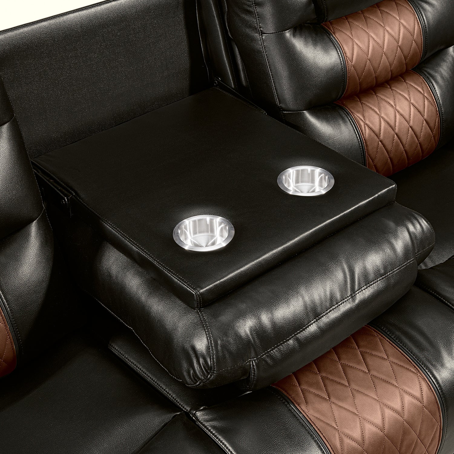 Enhance your living space with the Nikko Dual Recliner Sofa with Hidden Cupholders and Drop Down Snack Tray in brown. This sofa, constructed with hardwood and plywood frames, promises long-lasting durability and stability. Luxurious comfort is ensured with resilient foam cushions and pocket coil support, providing a cozy place to lounge. The two-tone chocolate and saddle brown fabric, made from a blend of 80% polyester and 20% PU, offers the soft touch and look of leather while remaining breathable. Distinctive details such as nailhead trim, diamond stitch pattern seats, double wrapped headrests, and expert tailoring make this sofa stand out in any home. Enjoy practical lifestyle features like the center back cushion that conveniently drops down into a snack tray complete with beverage holders, and hidden pull-out cupholders discreetly housed under the armrests. Plush pillowed arm and headrests, reclining backs, and comfortable footrests provide the perfect place to unwind. Upgrade your living room with the Nikko Dual Recliner Sofa and experience unparalleled comfort and style.