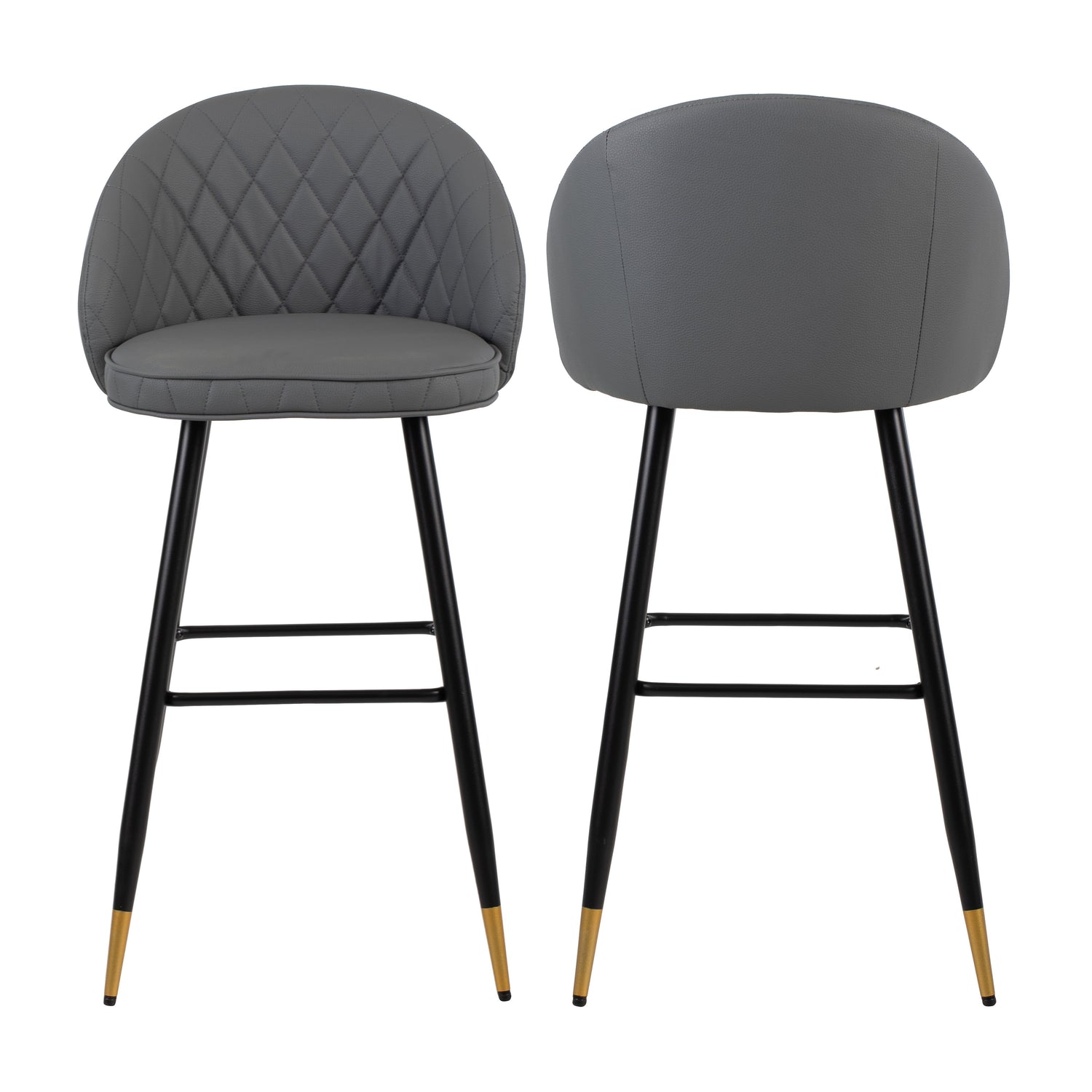 The Oliver Gray faux Leather Bar Stool set combines contemporary style with practical features to enhance any modern space. Each set includes two bar chairs with a sleek, arched back and low profile, offering a chic yet refined aesthetic. Crafted from eco-friendly vegan leather, the chairs deliver the luxurious look of leather without the maintenance, with intricate diamond tufting for added sophistication. The sturdy, tapered black iron legs provide excellent stability, resisting bending or breaking, and are accented with subtle gold detailing for a touch of elegance. Dual-purpose footrests ensure both added stability and a comfortable spot to rest your feet. A perfect blend of style and functionality, these bar chairs offer long-lasting comfort and timeless design—an excellent addition to any home or bar setting.
