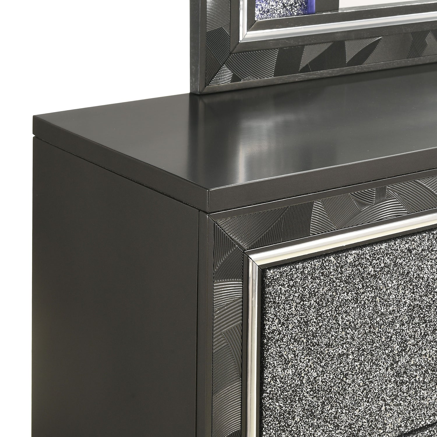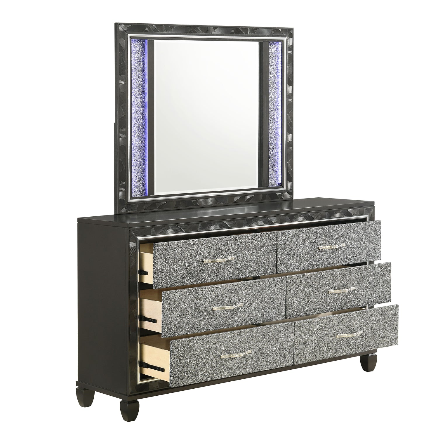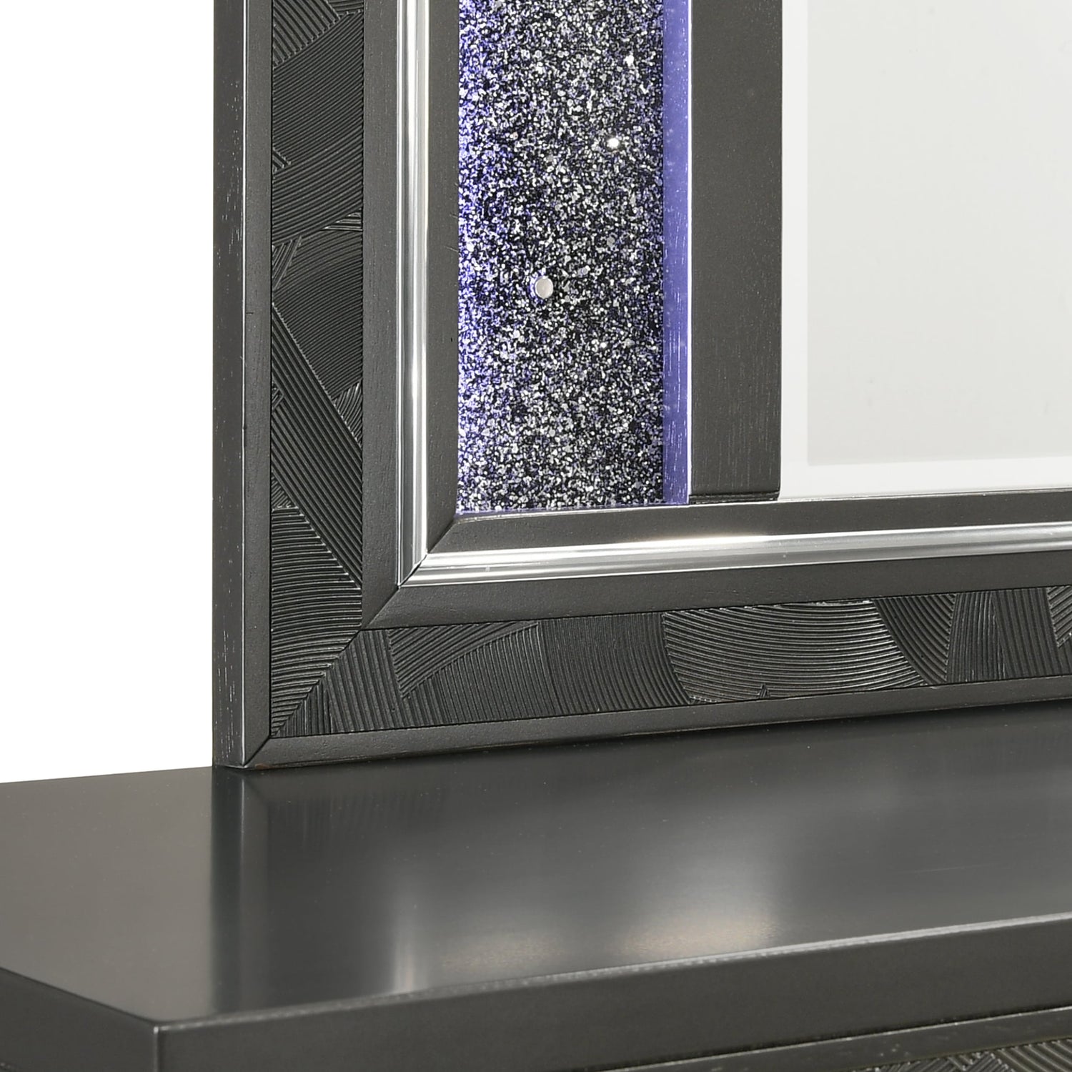 Introducing the Radiance Lighted Mirror in Black Pearl, meticulously designed to complement the Radiance 6 Drawer Dresser. Crafted from a blend of Solid Rubberwood and engineered woods, this mirror ensures unparalleled stability and durability. Its semi-gloss lacquer black pearl finish adds a silky, contemporary touch to your space. Adorned with glossy black textured inlays, mylar trim, and a crushed crystal decorative laminate frame, this mirror exudes opulence and glamour. Featuring a clear, low distortion beveled glass mirror, it delivers true reflections, while the LED lighting accents your surroundings, casting a sparkling glow against the luxurious frame. Elevate your bedroom decor with the functional elegance of the Radiance Lighted Mirror.