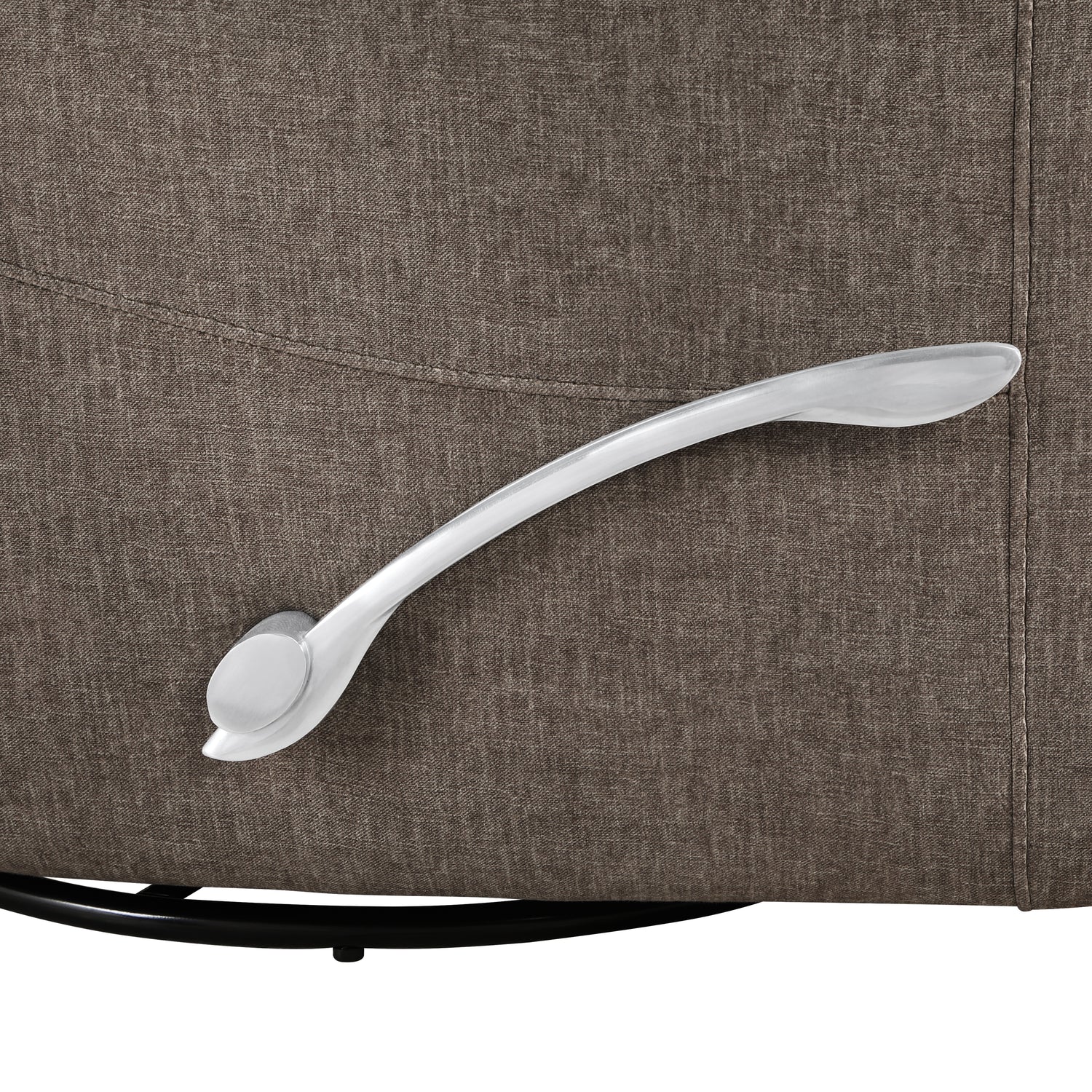 The Takami Swivel Recliner in Chocolate offers a perfect blend of comfort, durability, and style for your living space. Expertly crafted with a hardwood and plywood frame, it provides exceptional strength and stability, ensuring it stands the test of time. High-density foam and coil seat cushions, paired with a plush foam and feather blend back, deliver unbeatable comfort and support. Upholstered in 100% polyester fabric, this recliner combines the rich, warm feel of chocolate brown with the durability you need for everyday use, staying fresh for years to come. Enjoy the flexibility of effortlessly swiveling for engaging conversations or reclining for complete relaxation. The adjustable headrest allows you to personalize your comfort for the perfect seating experience. With its sleek silver recliner pull, tailored lines, and triple rolled back design, the Takami Swivel Recliner blends contemporary flair with a transitional appeal, making it a versatile addition to any room.