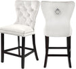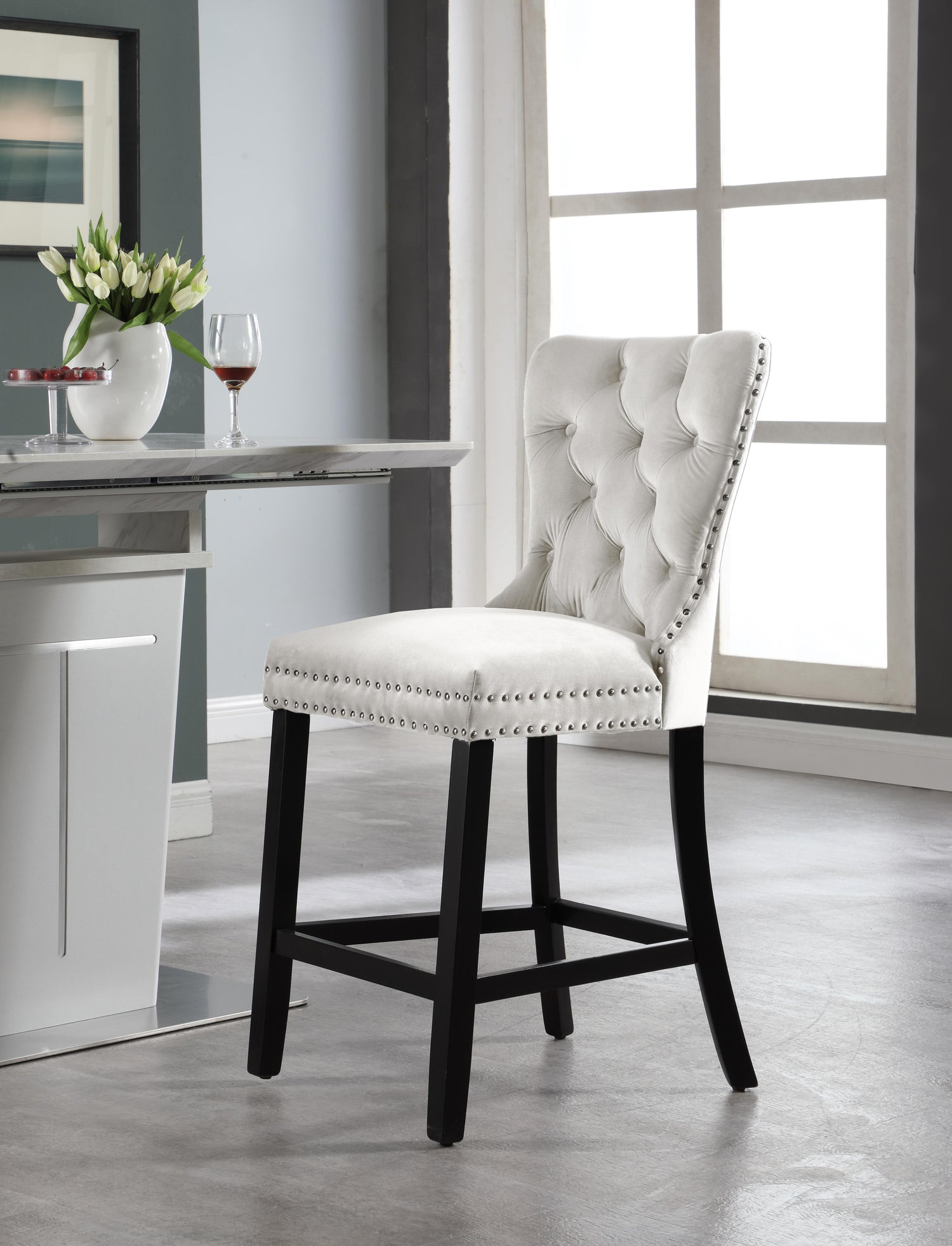 Lounge in luxurious style with the Nikki cream velvet counter stool. Featuring a curved high back, plush cushioned seat and deep tufted cream velvet upholstery studded with chrome nailheads, this counter stool is sure to take your dining experience to a whole new level. Espresso wood legs provide sturdy support and complement the stunning cream upholstery for a sleek, contemporary design.