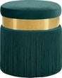 Glam it up with this Yasmine Green Velvet Ottoman/Stool. An elegant design marries traditional design elements with contemporary panache, with the result being this fabulous stool that will become the center of attention wherever you use it. The top of this beautiful stool is covered in velvet for a chic sophistication and soft comfort as you sit. The bottom is outfitted with thin tassels for added texture and fun, and a stainless steel band intersects the top and bottom to form an interesting and visually stunning contrast.