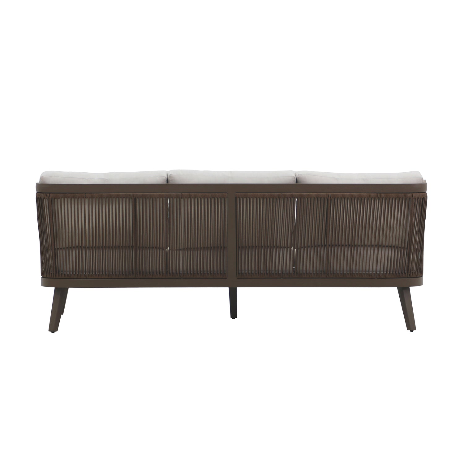 - Contemporary Design: With clean lines, neutral tones, and a focus on sleek, functional design, this outdoor furniture embodies modern sophistication. The seat backs showcase a woven rope pattern, delivering an open and airy ambiance while offering solid structural support. The evenly spaced vertical strands enhance the minimalist aesthetic, adding texture and style to any outdoor space.