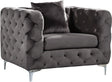Sink into the welcoming comfort of this Scarlett grey velvet chair. This chair defines elegance and sophistication with its boxy retro look and its deeply tufted upholstery that covers every inch of the sides, back, and front. The grey velvet material feels luxurious to the touch while the chromed legs lend the chair sturdy support and a modish finish. Pair it with other items in the Scarlett collection for a complete look.