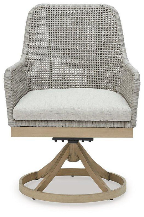 This swivel bar stool invites your casual contemporary style outdoors. With its resin wicker in a chic neutral hue, it expertly marries refined design with durability. The 360-degree swivel makes it easy to switch from watching the kids at the pool to grabbing a drink from the table. And breezy summer mornings and cold winter nights are made all the more comfortable with high-performance Nuvella+™ fabric covering the seat cushion.