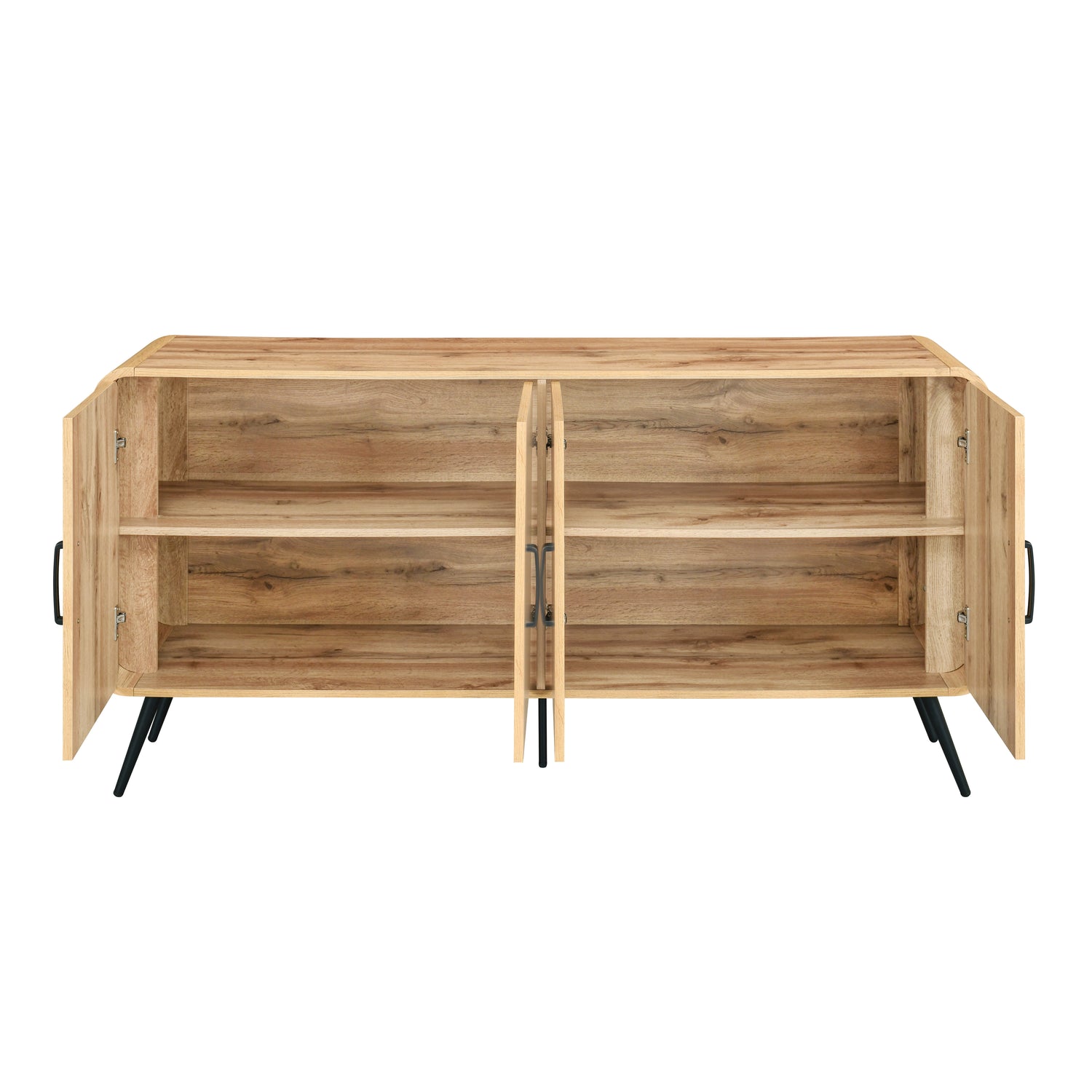 The Rowan 63" Sideboard doubles as a stylish TV stand with mid-century modern flair. Crafted from eco-friendly manufactured wood in a warm oak finish, it features rounded corners, black hardware, and tapered legs. Four cabinet doors conceal spacious shelves—perfect for storing media, electronics, or dining essentials. A versatile piece that works beautifully in living or dining spaces.
