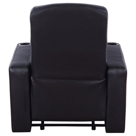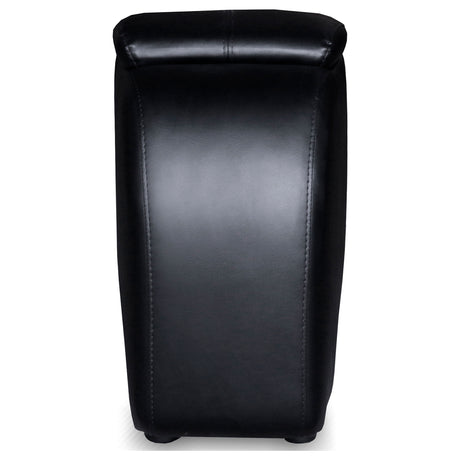 Dress up a home theater room with this sleek black console. Great for nestling between chairs, this console was designed with comfort in mind. Add extra space between recliners with the smooth front and the rounded top. Deep tones offer a clean feel to the modern silhouette. Build a set of side by side recliners for family movie night or to fill any size theater room.