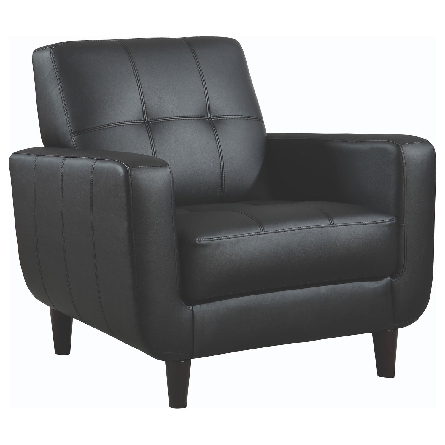 Change up the personality of a contemporary space. With a minimalist profile, this accent chair offers a fresh blend of modern and mid-century modern. Padded in all the right places, it offers hours of comfort. Black upholstery with decorative stitching brings a special aesthetic. Tapered cappuccino legs bring a charming softening touch.
