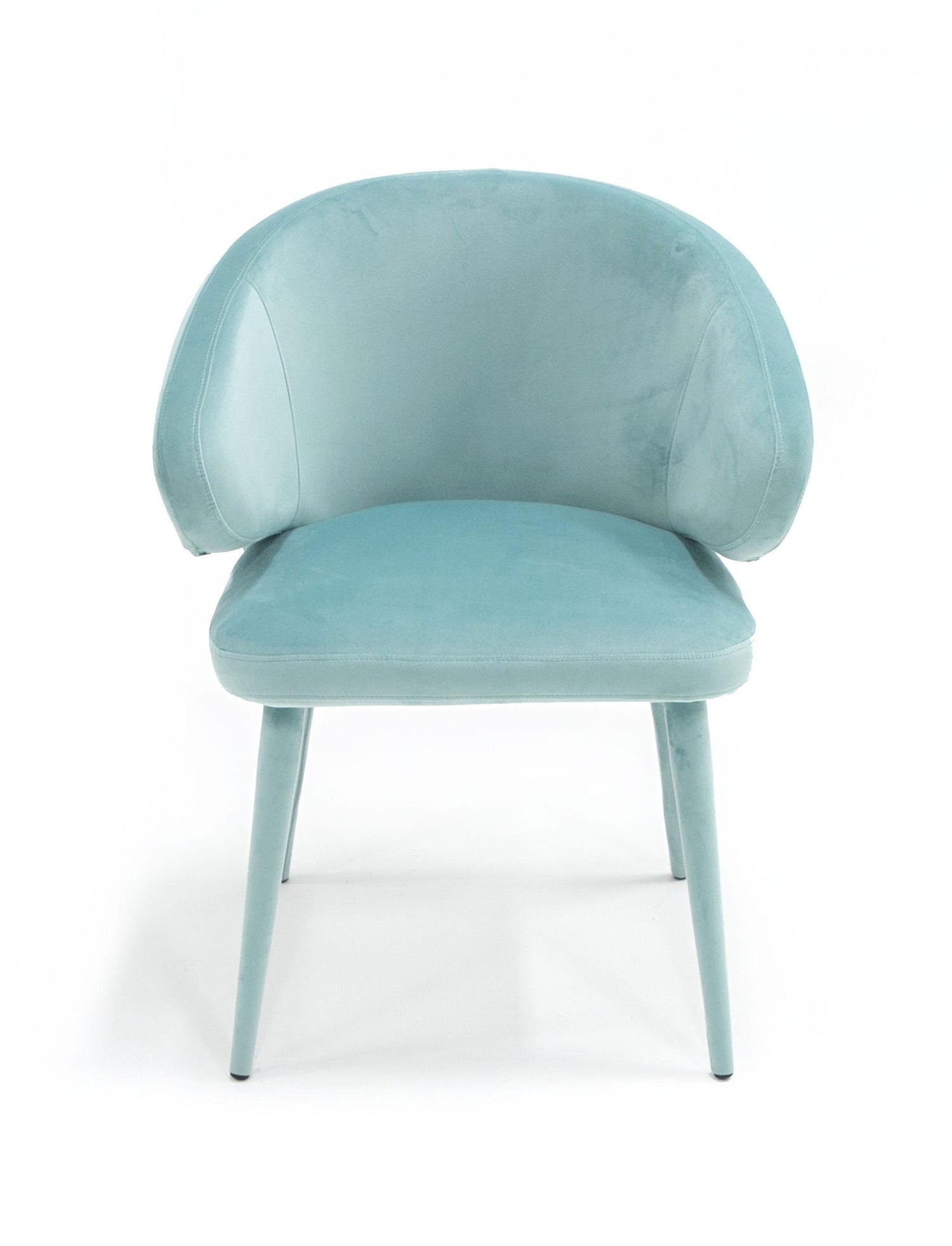 Bold and beautiful, a dining chair that has an abundance of style that will make any meal an occasion. From the wonderful curves that sweep through the backrest to form the winged armrests, to the amazing Aqua color, this is a dining chair that makes a true style statement wherever you put it. Ready to go with no assembly required, this dining chair is not all look, with the soft, luxurious velour upholstery and generous padding it also feels as good as it looks. The metal legs and frame are upholstered to match, giving this chair a unique look. Comfortable, stylish dining that is perfect for any home.