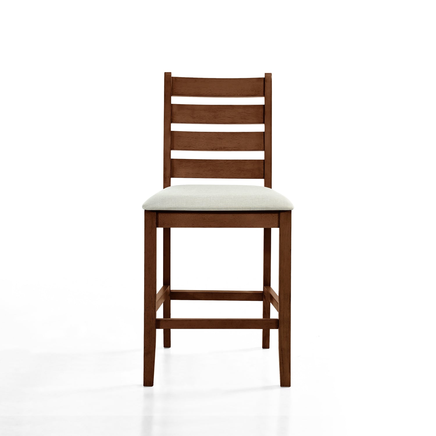 Introducing the Pascal Ladderback Counter Chairs in warm Walnut Brown, a perfect blend of durability and style. Sold in sets of two, these counter-height chairs are crafted from solid Rubberwood and feature four base stretchers for enhanced stability, ensuring they withstand daily use with ease. The chairs boast a rich, sophisticated finish achieved through a meticulous multi-step process, including rub-throughs and glazing that enhance the natural beauty of the wood. Designed for comfort, each chair includes high-density foam cushions covered in easy-care 100% polyester fabric, offering a comfortable seating experience. With subtly rounded edges, tapered legs, and a classic ladderback design, these chairs bring an upscale look to any space. Their versatile style seamlessly fits into transitional, farmhouse, and contemporary decor, making the Pascal Ladderback Counter Chairs a stylish and practical addition to your dining or kitchen area.