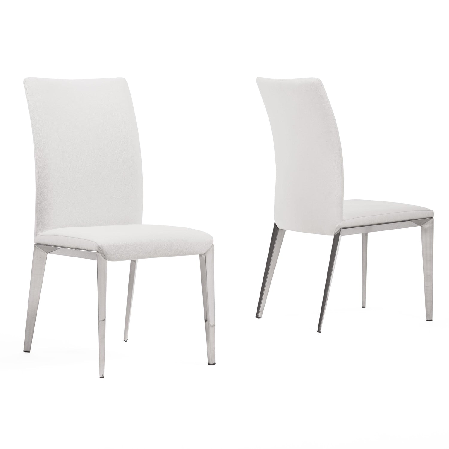 This set of 2 Taryn - Modern White Dining Chair features a dainty triangular stainless steel frame upholstered in dainty white leatherette. This modern dining chair with medium-height back features curved corners and back edge. Rubber stoppers on legs prevent damage on your floor.