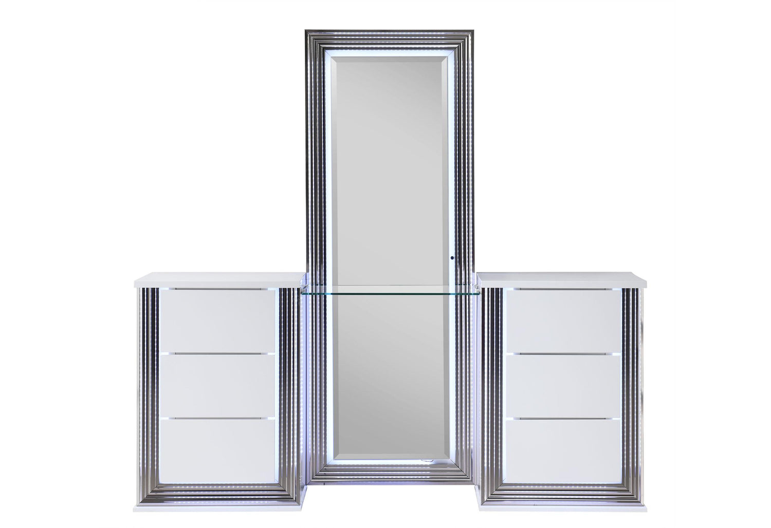 Introducing the Ylime Collection by Global Furniture USA - a stunning addition to any bedroom. Crafted with a sleek, deco modern design, this collection features rich chrome accents on all pieces and LED accent lighting. The real showstopper is the LED accents that add a touch of luxury and sophistication to the overall look. An available large matching vanity with stool makes this one of the most accommodating, complete solutions for your bedroom.
