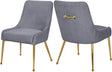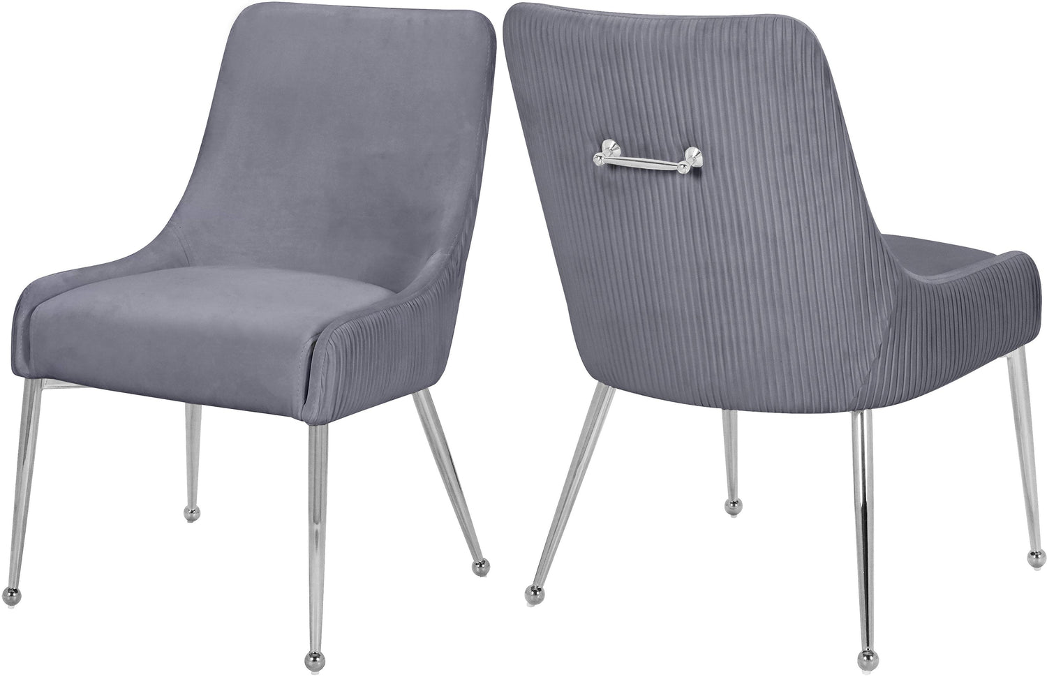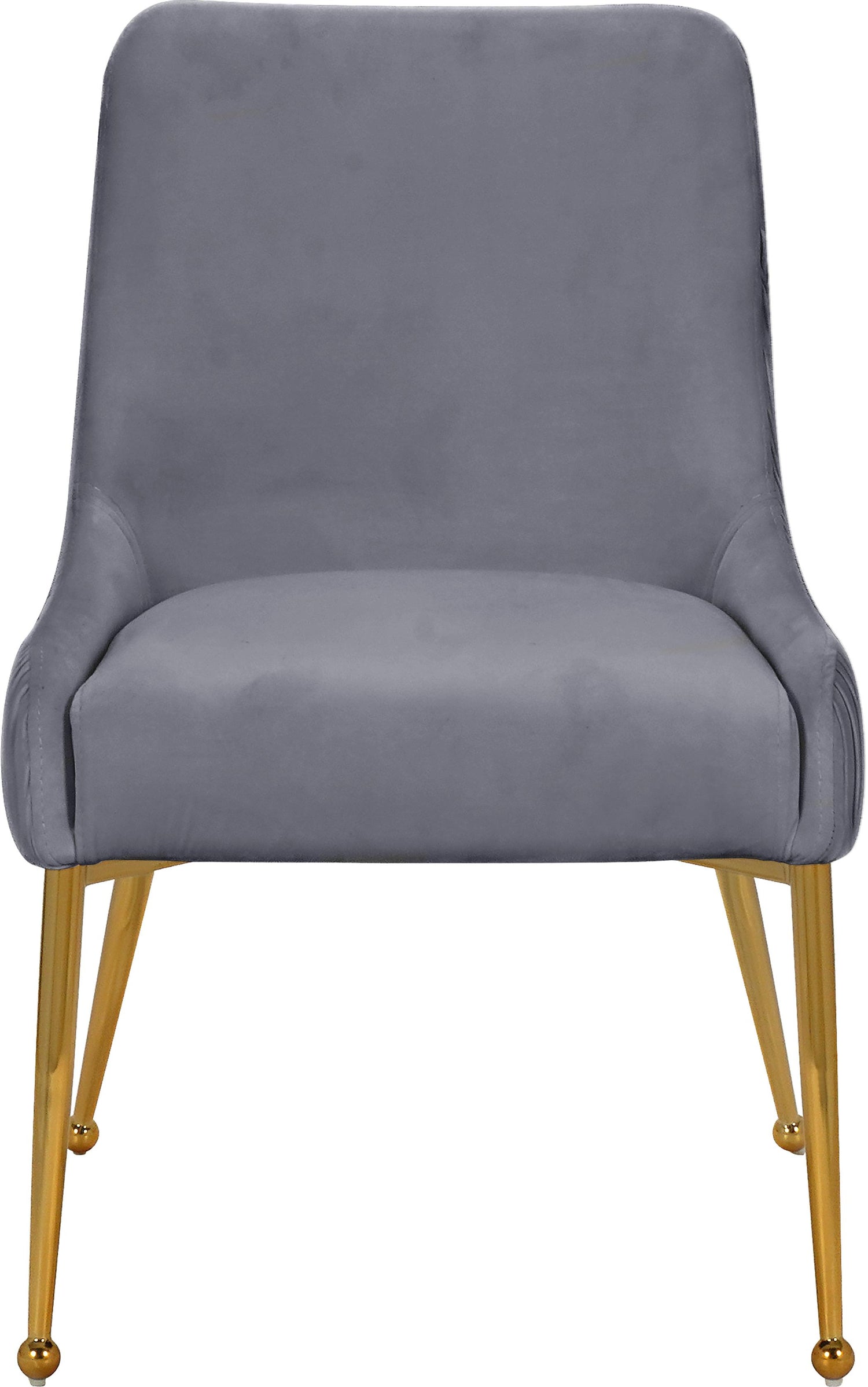 Elegance invades your dining room when you add this Ace velvet dining chair to the mix. This beautiful chair features the bells and whistles you need to take your dining room to the next level decoratively. The chair is outfitted in soft grey velvet upholstery with a pleated design for added textural appeal. Polished gold legs with ball feet and a matching gold handle on the back round out the design on a stylish note.
