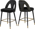 Modern and traditional elements collide in the design of this Akoya Black Velvet Stool. Velvet upholstery covers the back and seat, giving it a decidedly glamorous look while two strategic cutouts provide just a hint of bold, modish fun. The gold nailhead trim on the back adds an edgy vibe, and metal legs in a black finish with goldtone tips rounds out the stool, providing sturdy support and a contemporary look.
