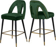 Modern and traditional elements collide in the design of this Akoya Green Velvet Stool. Velvet upholstery covers the back and seat, giving it a decidedly glamorous look while two strategic cutouts provide just a hint of bold, modish fun. The gold nailhead trim on the back adds an edgy vibe, and metal legs in a black finish with goldtone tips rounds out the stool, providing sturdy support and a contemporary look.