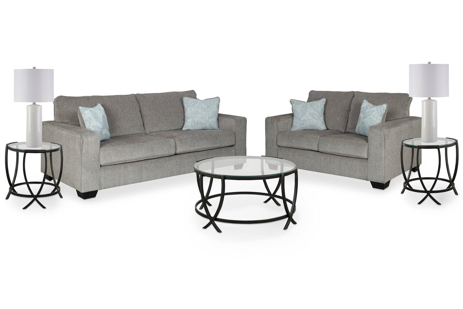 If style is the question, then this room package is the answer. The sofa and loveseat feature clean lines and sleek track arms enhanced with plump cushioning and a chenille-feel upholstery. A clear winner for lovers of contemporary style, the coffee table and end tables make a brilliant impression with a metal arc X-motif. Two ceramic table lamps have bases teeming with texture, proving that a monochromatic design can be visually interesting.