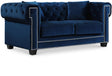 The Bowery Collection by Meridian Furniture. Features beautifully designed tufted velvet upholstery with custom wood legs and a nail head trim. This collection is guaranteed to be the highlight of any home. Throw pillows included.