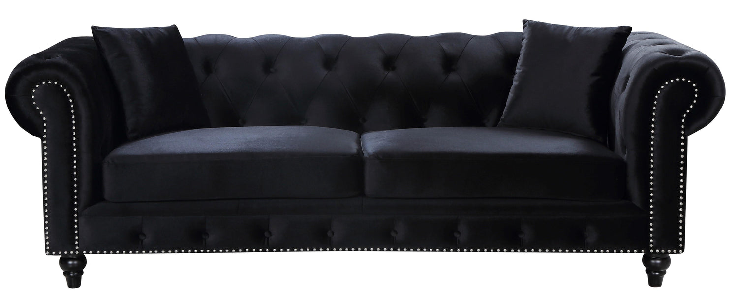 Elegant and eye-catching, the stunning Chesterfield Living Room from Meridian Furniture is the perfect addition to any space. Rich Velvet covers the plush, comfortable seat, padded with high-density foam and modern tufted design. Strength and beauty is guaranteed with a solid wood frame and legs. Features a nail head design on the arms and includes matching throw pillows.