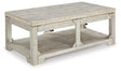 Take in the country fresh look of this lift top coffee table and reminisce of a simpler time. Its farmhouse style is evident in its stocky design with planked top/bottom shelf, unique triangle accents and relaxed white washed finish. With a handcrafted look thanks to reclaimed wood, you'll love the casual feel this piece brings to your living area. Plus, easy lift top feature accommodates eating or working in front of the television._x000D_