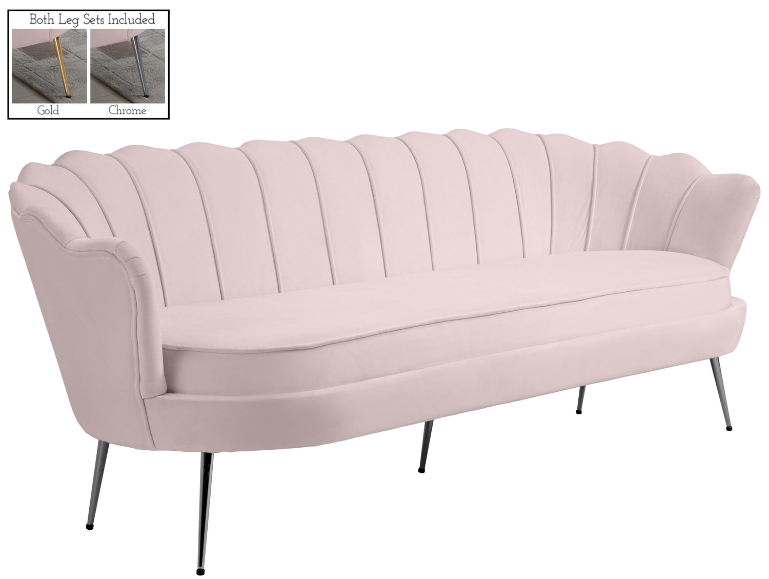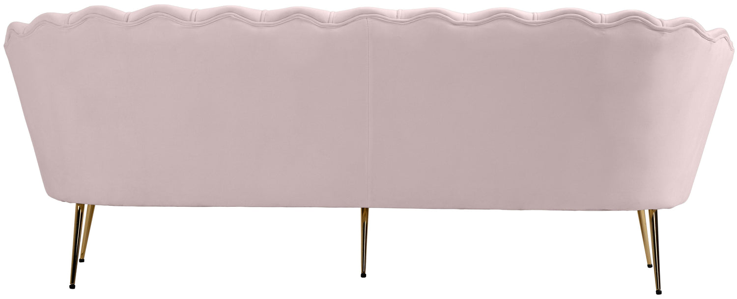 Gardenia Pink Velvet Sofa is backordered and will ship as soon as it is back in stock.