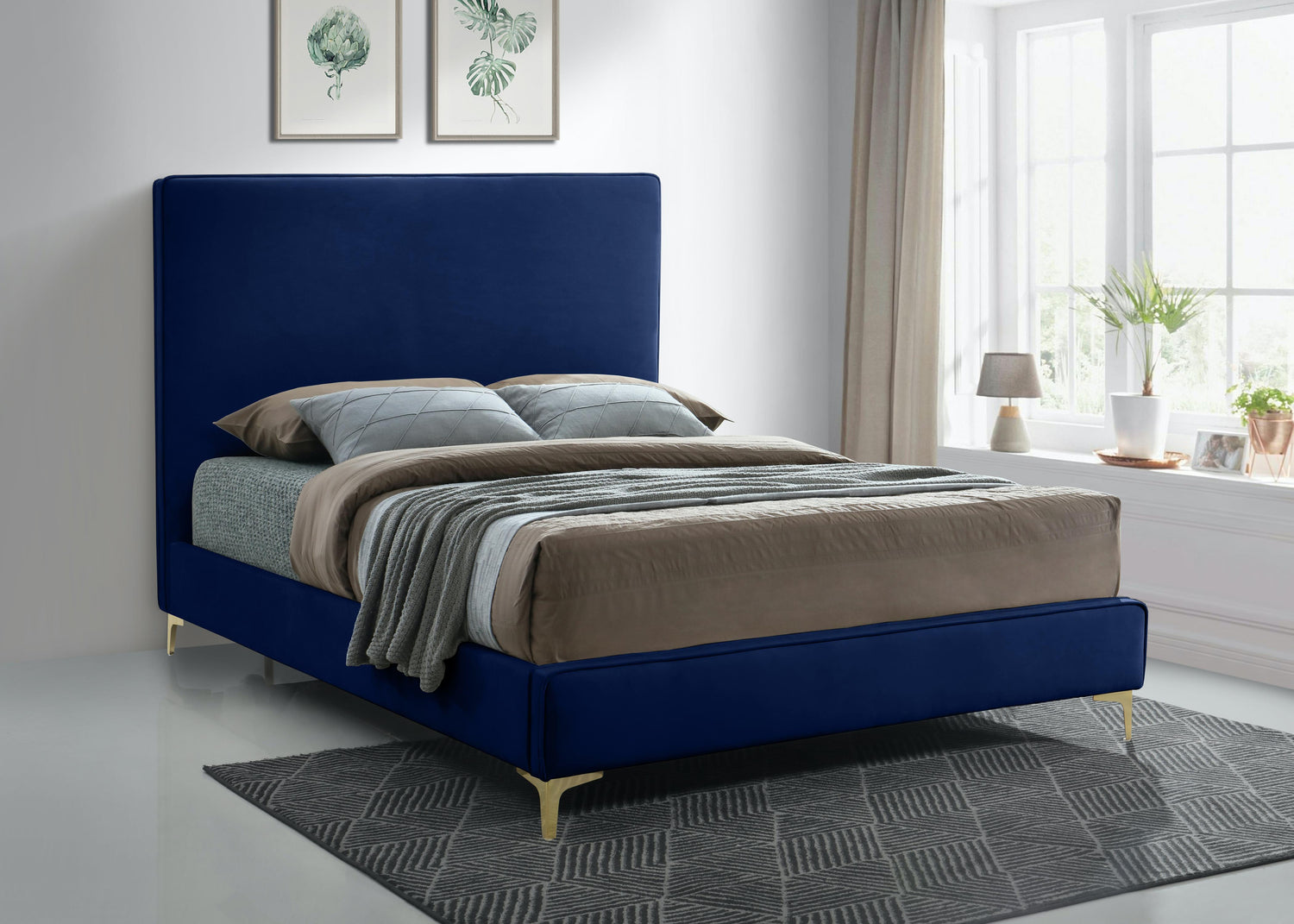 Provide yourself with a few options when you choose the sleek Geri navy velvet king size bed. The headboard, side rails and footboard are all cushioned and upholstered, with snazzy decorative piping on the headboard and footboard. This bed comes with two different sets of legs so you can match your other d?�cor. Use the gold ones, the chrome ones, or two of each color for a truly contemporary approach.