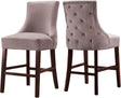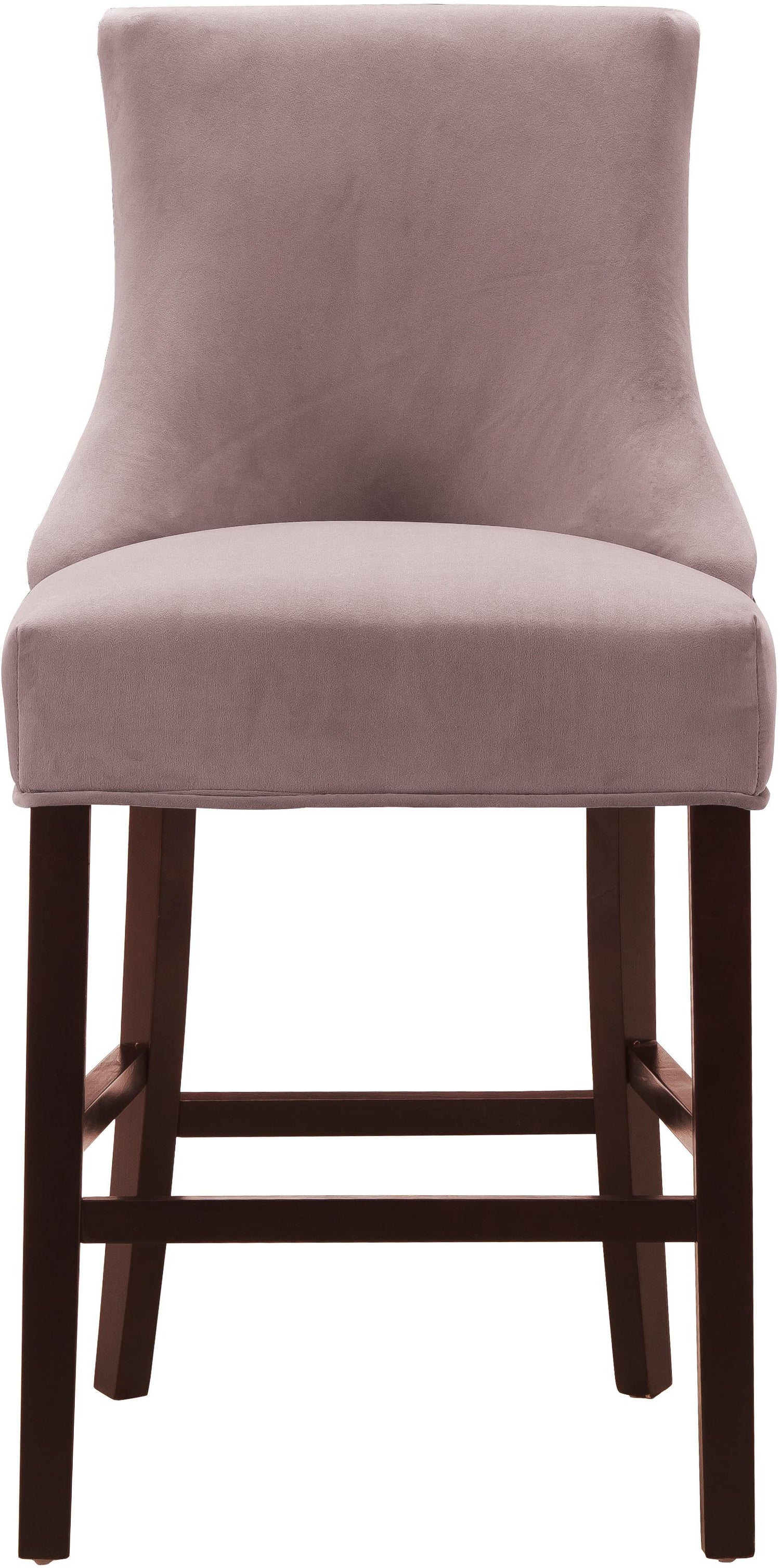 Add this Hannah Pink Velvet Stool to your home bar or kitchen counter to seat guests comfortably and in chic fashion. The pink velvet upholstery is thick and durable and has a slight sheen for a touch of glam. The back of the seat has deep button tufts for a posh look, while the front features smooth velvet upholstery for sleek comfort. The base is made from wood with an espresso finish and has a foot rail for extra support and comfort as you sit.