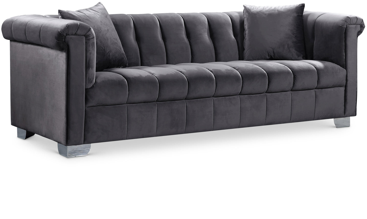 The Kayla Collection by Meridian Furniture. Features beautifully designed velvet upholstery with custom chrome legs. This collection is guaranteed to be the highlight of any home. Throw pillows included.