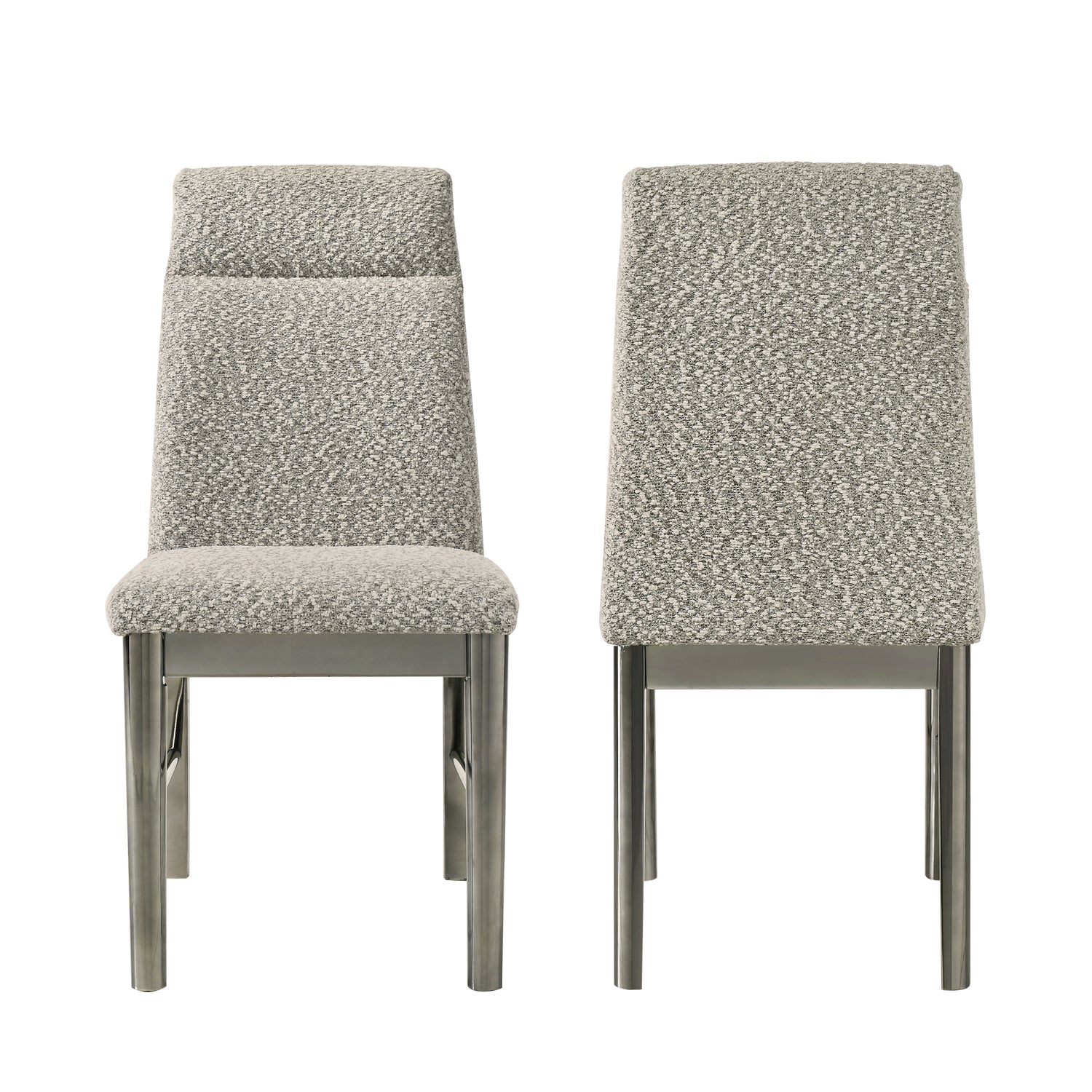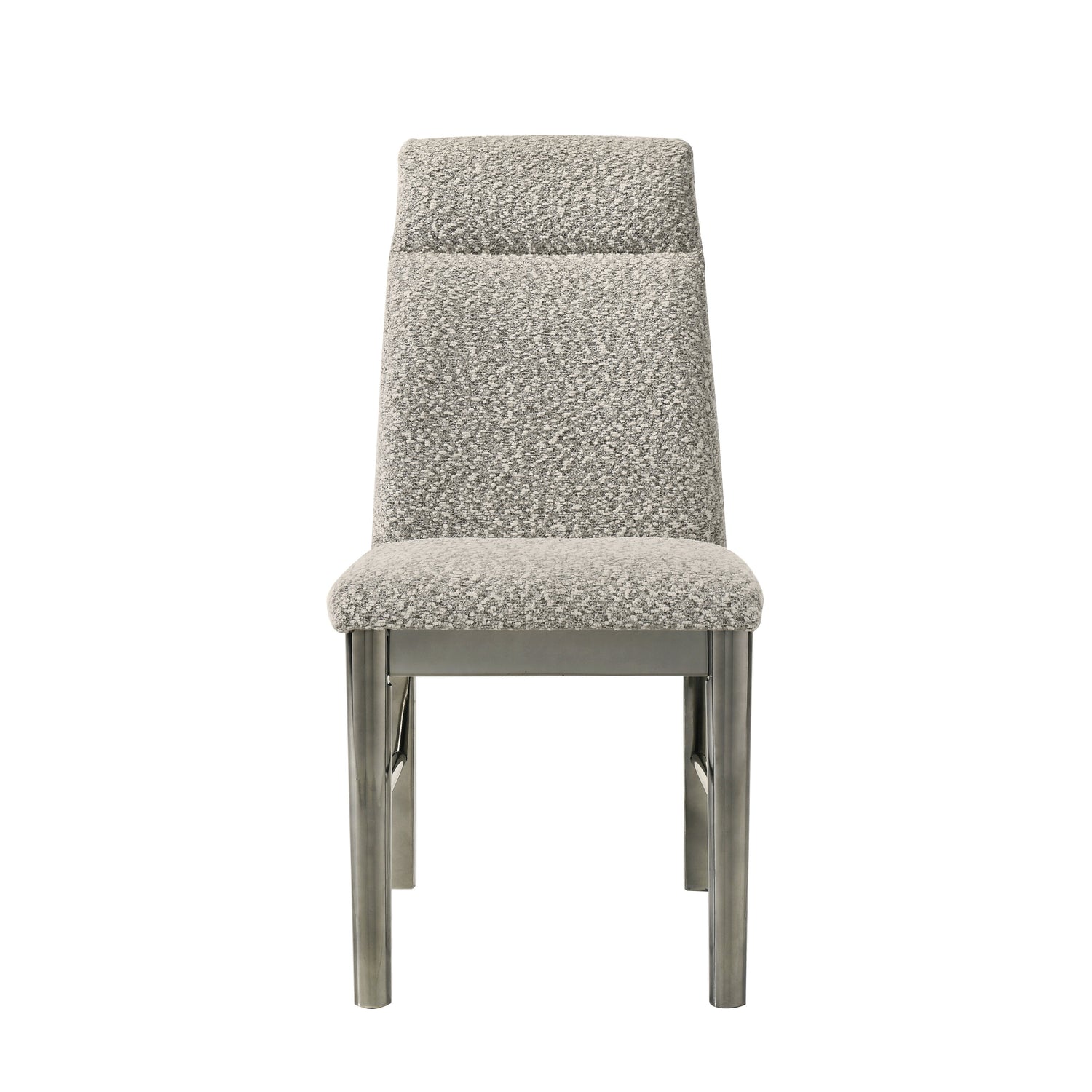 The Lennox Upholstered Side Chair, sold as a set of two, brings together exceptional craftsmanship, sophisticated design, and unmatched comfort to elevate your dining experience. Expertly crafted from premium solid Rubberwood and genuine Ash wood veneers, these chairs ensure long-lasting durability while maintaining a refined and elegant look. The sleek design features rounded legs and seat frames with a metallic silver finish that perfectly complements the soft neutral tones of the pale gray fabric. Upholstered in luxurious boucle fabric, these chairs offer a plush, textured elegance that provides both high-end comfort and a warm, inviting charm. Ideal for both everyday dining and special occasions, the Lennox Side Chairs are a perfect blend of style and practicality.