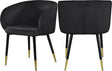 Redefine your living space with this modish Louise Black Velvet Dining Chair. Featuring stunning velvet black upholstery and a curved back, this chair offers a comfortable seat for you to relax in. With a frame supported by black metal legs with gold tips, this contemporary chair is not only sturdy and eye-catching; it���s stylish appeal and durability is sure to make it a favorite in your home for years to come.